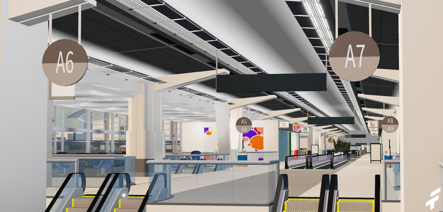 -Full, detailed interior on the A-gates concourse, along with the main check-in and security area.