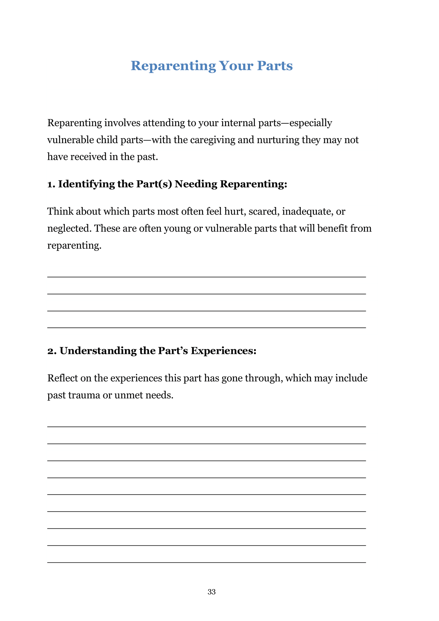 Note: As you prepare to engage with these worksheets, please ensure you are in a safe space, both physically and emotionally. If at any point the process becomes too intense or you feel overwhelmed, consider pausing and returning to it later or discussing it with an IFS-trained therapist.