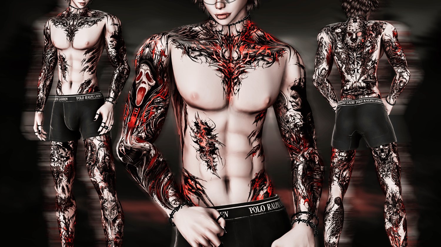 All tattoo textures must be overlaid onto a skin texture of your choice for that base using either an image editor of your choice, or using the Decal function of Poiyomi Toon Shader. I WILL NOT PROVIDE A CLEAN SKIN TEXTURE TO USE, EVEN WITH PERMISSION FROM ORIGINAL CREATOR. Please acquire one by buying the base itself, a skin texture pack, or contacting the creator of the avatar you intend to use the tattoos for.