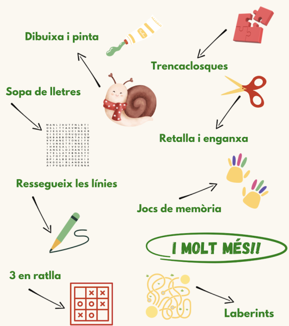 Amb dibuixos per pintar, dibuixos que hauran de completar, línies per resseguir, per retallar, sopes de lletres, laberints, trencaclosques… Hi ha una seixantena de fulls perquè els més petits es diverteixin.