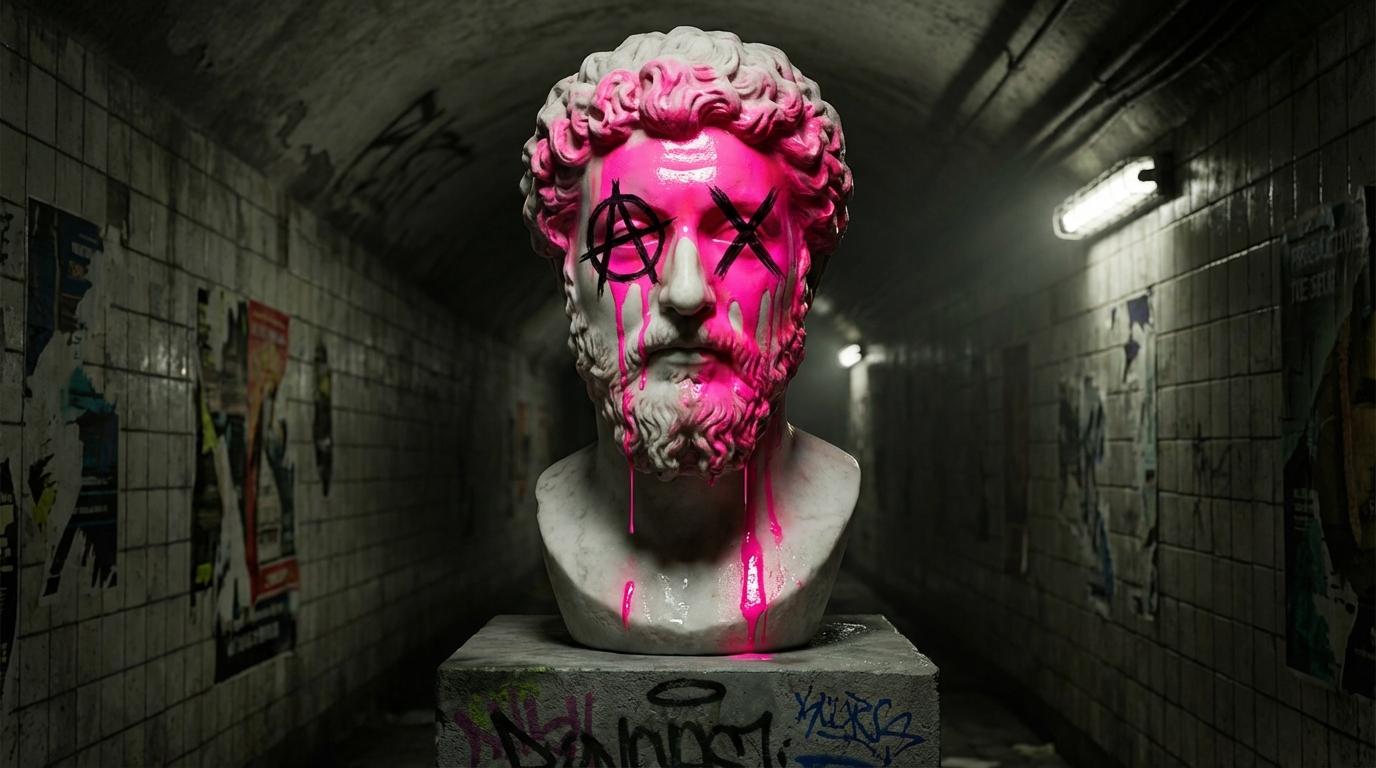The piece gains its power through intentional desecration; the pristine white marble is fractured by visceral drips of neon magenta paint and stark black iconography. The anarchy symbol over the right eye and the "X" over the left serve as a poignant commentary on the death of traditional authority and the re-emergence of Stoic philosophy within the chaotic landscape of modern punk subculture.