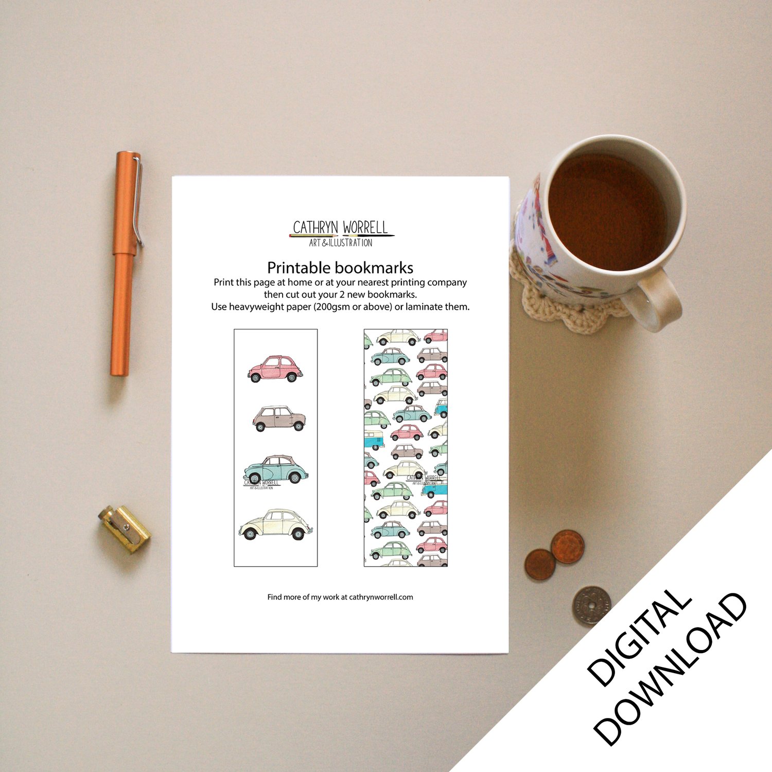 This set of 2 bookmarks feature my hand drawn illustrations of vintage cars. Print out the file on thick paper or card and cut out each bookmark.
