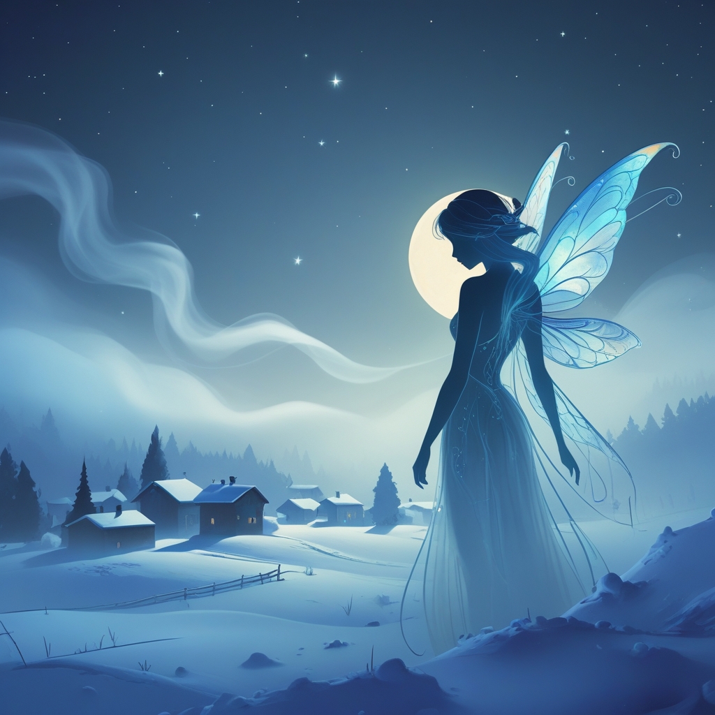 A serene and enchanting moonlit night scene overlooking a quaint, snow-covered village, with a delicate, ethereal silhouette of a fairy-like woman subtly merging with the wispy mist, her slender figure adorned with intricate, iridescent wings and a flowing, silky hair that blends seamlessly with the fog, set against a soft, gradient blue-gray sky with a few scattered, twinkling stars, rendered in a vibrant, cartoon 3D HD style with bold lines, delicate textures, and subtle shading, evoking a dreamy, mystical, and captivating atmosphere.