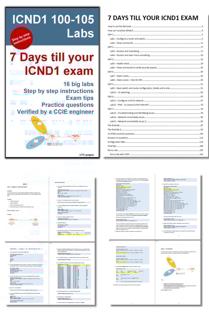 7 Days Till Your ICND1 100-105 exam is an ebook with 16 big labs covering every major topic you can face in your exam. Review all the key topics, learn how to troubleshoot and approach network issues. This e-book has been verified by a CCIE certified engineer as well.
