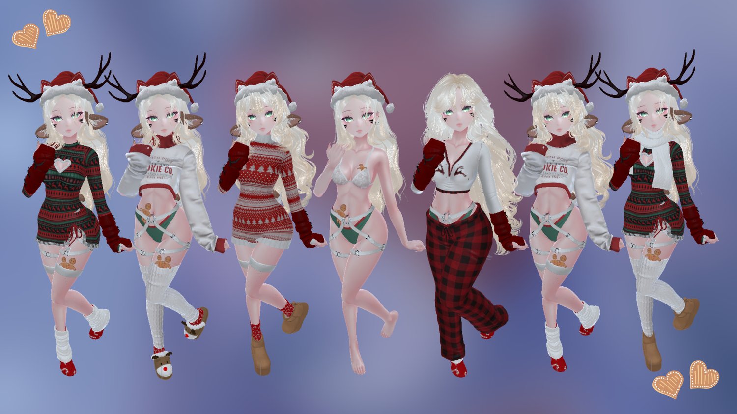 - arm warmers, earrings, harness, Santa hat, scarf, antlers, deer ears/tail (my edit do not reuse), leg warmers, panties/bra, pj bottoms, socks, sweat pants, wool thigh highs, harness, thigh high socks, boots, little boots, slippers, dress, dress 2, pj top, sweater, gingerbread men everywhere!
