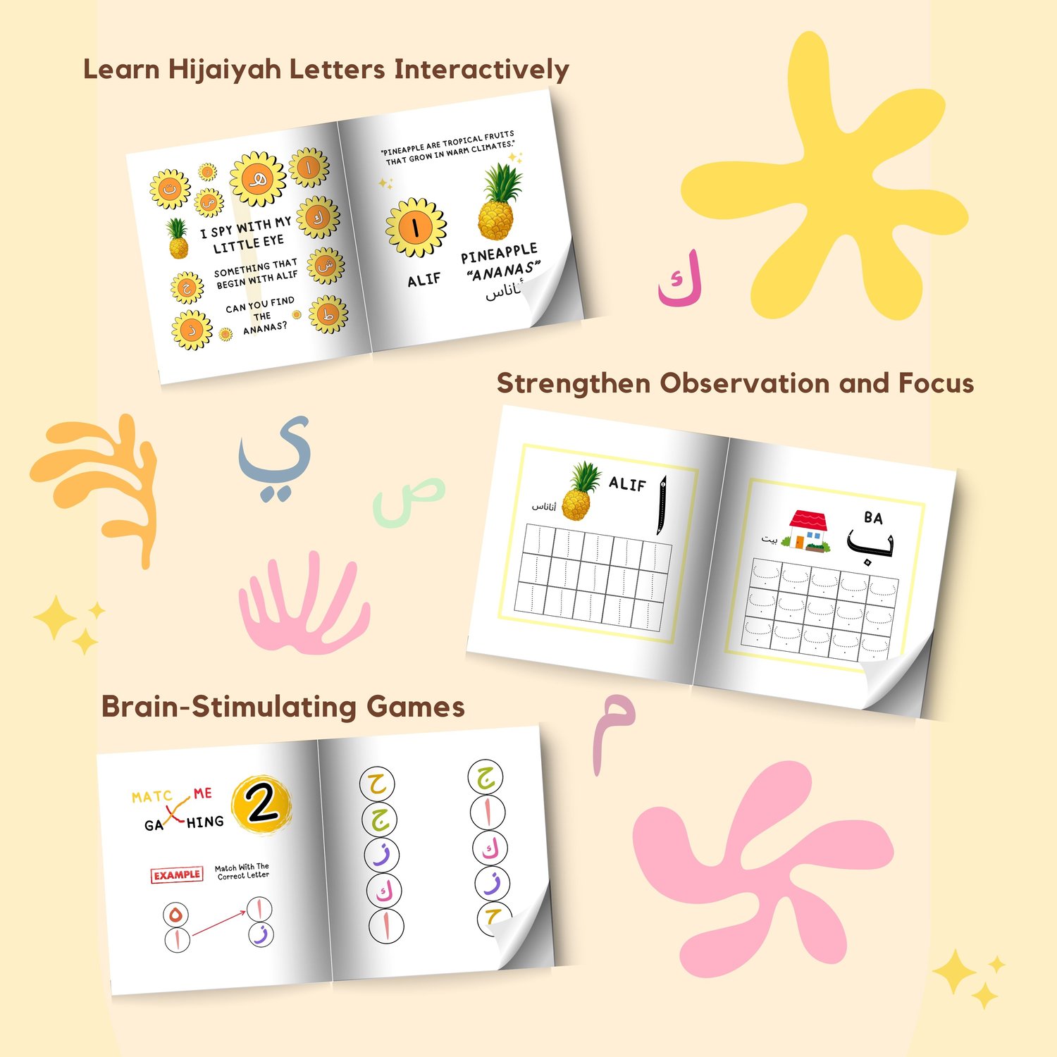 Each Arabic letter includes guided tracing to strengthen handwriting, memorization, and early literacy.