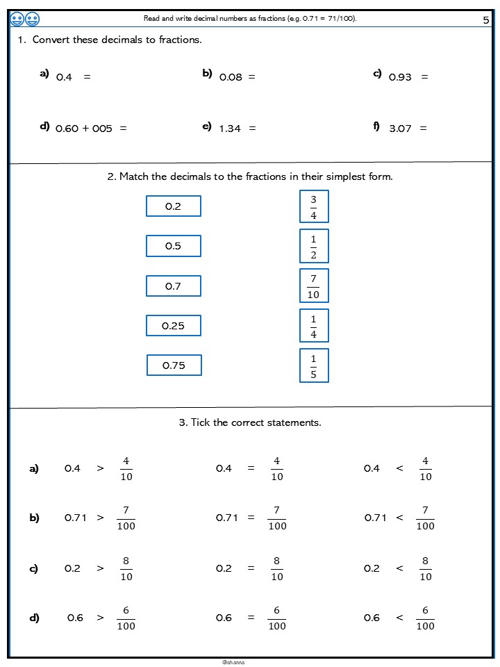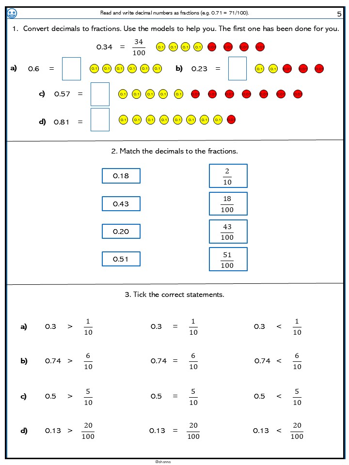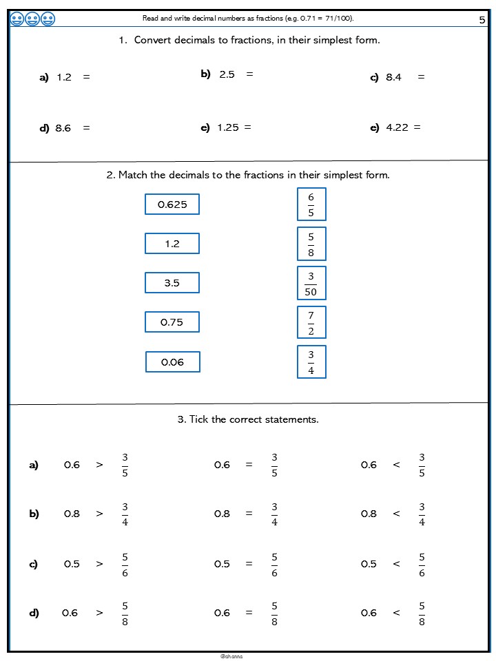 Children convert decimals to fractions and mixed numbers.