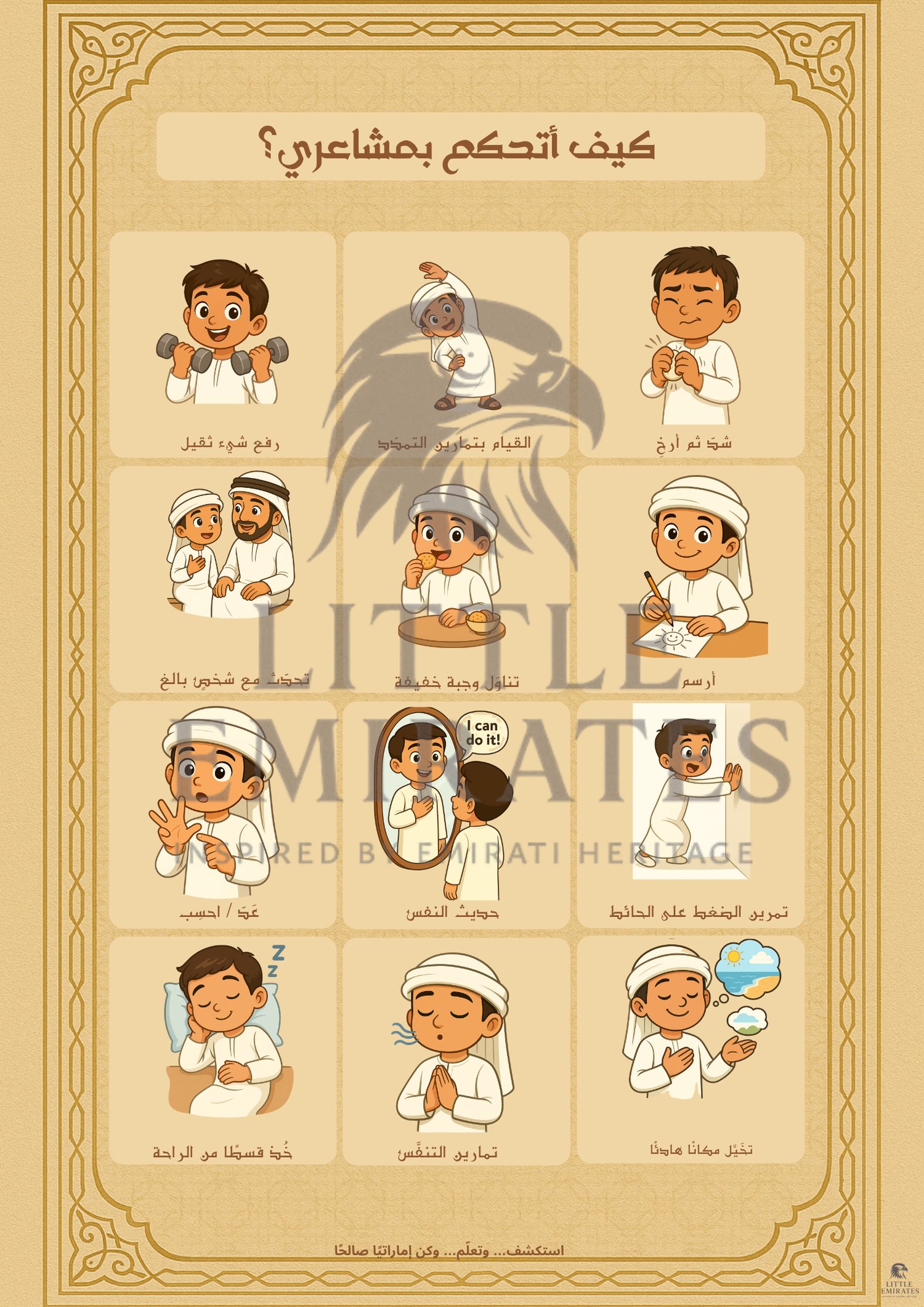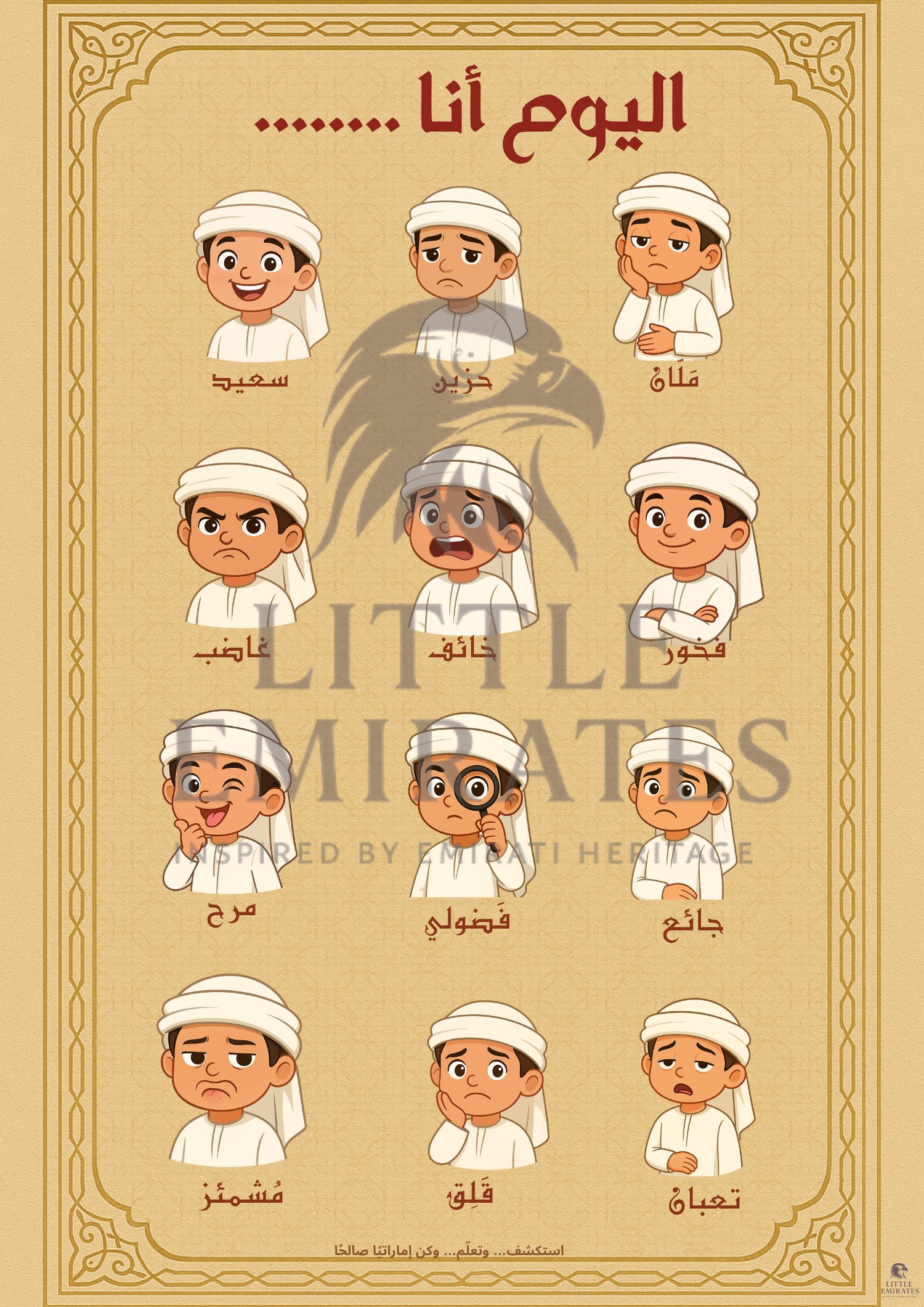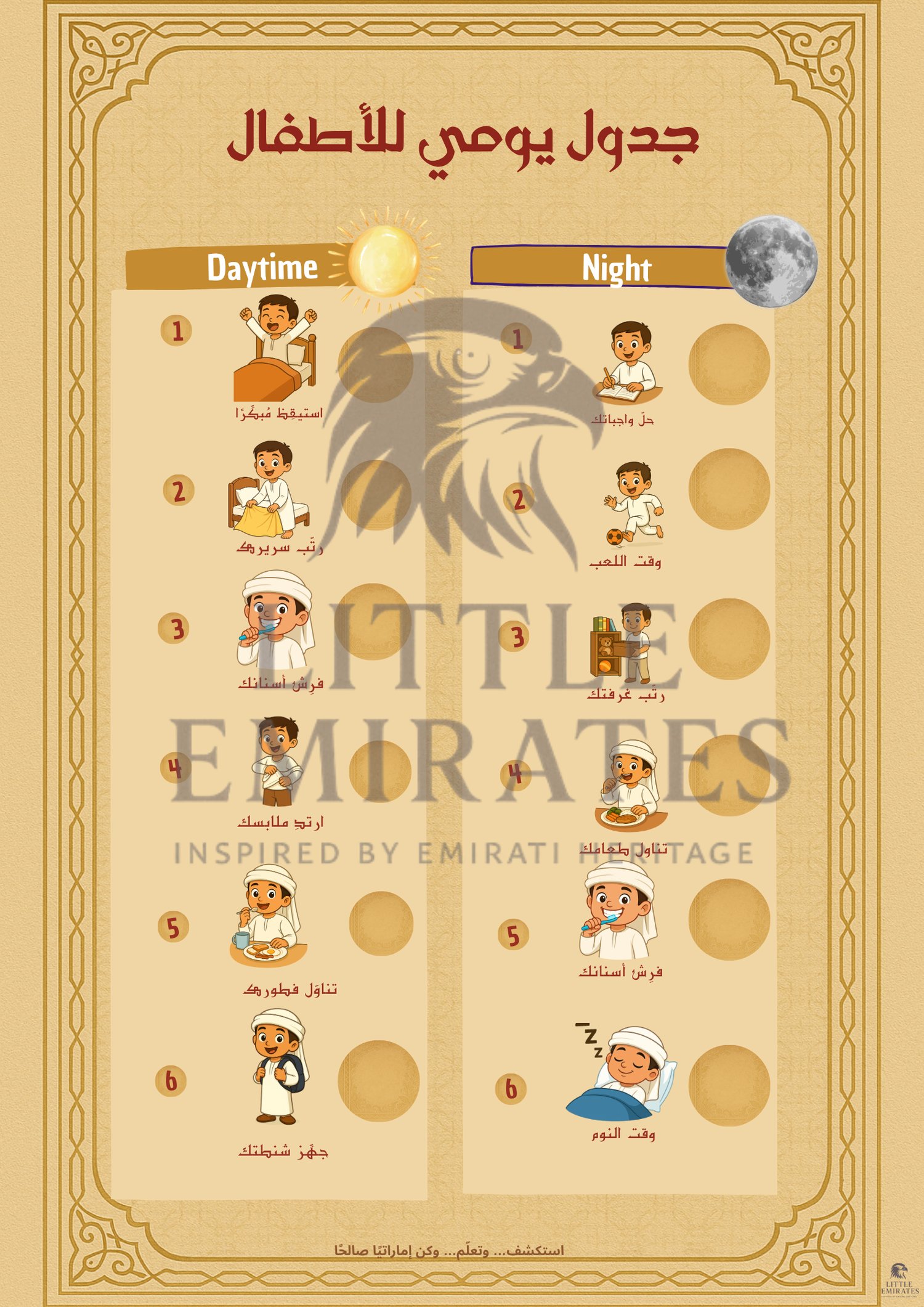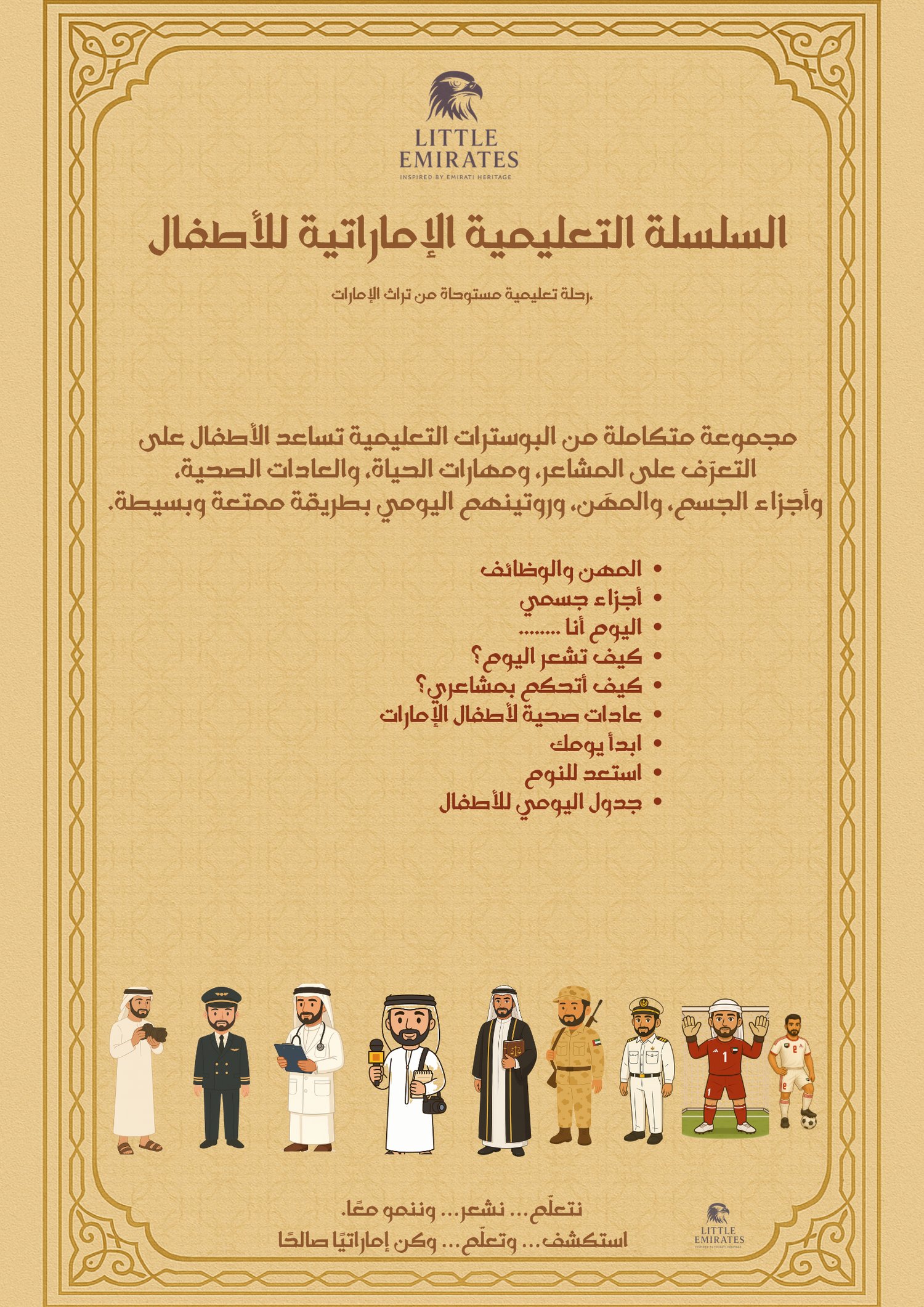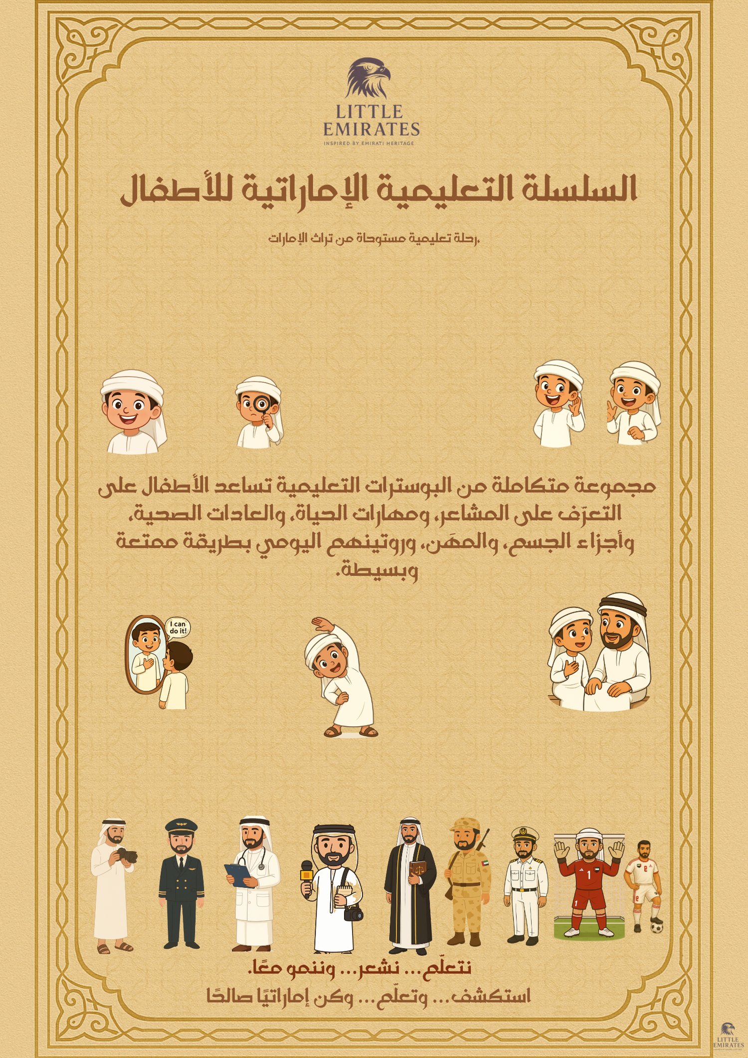 بوسترات تعليمية عربية مستوحاة من تراث الإمارات، تساعد الأطفال على التعرّف على المهن، المشاعر، العادات الصحية، أجزاء الجسم، ومهارات الحياة اليومية… كلها