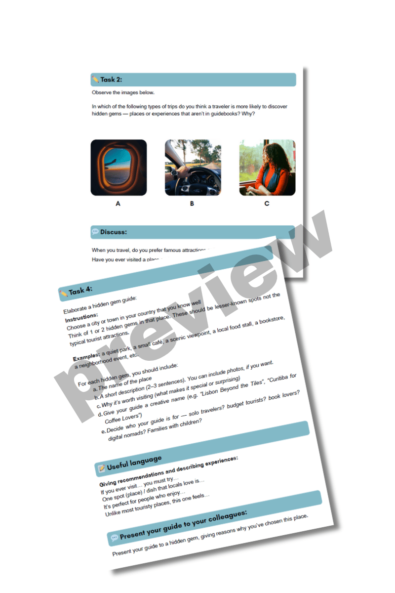 - Creative speaking/writing task: students create their own “Hidden Gem Guide” with audience targeting and recommendations