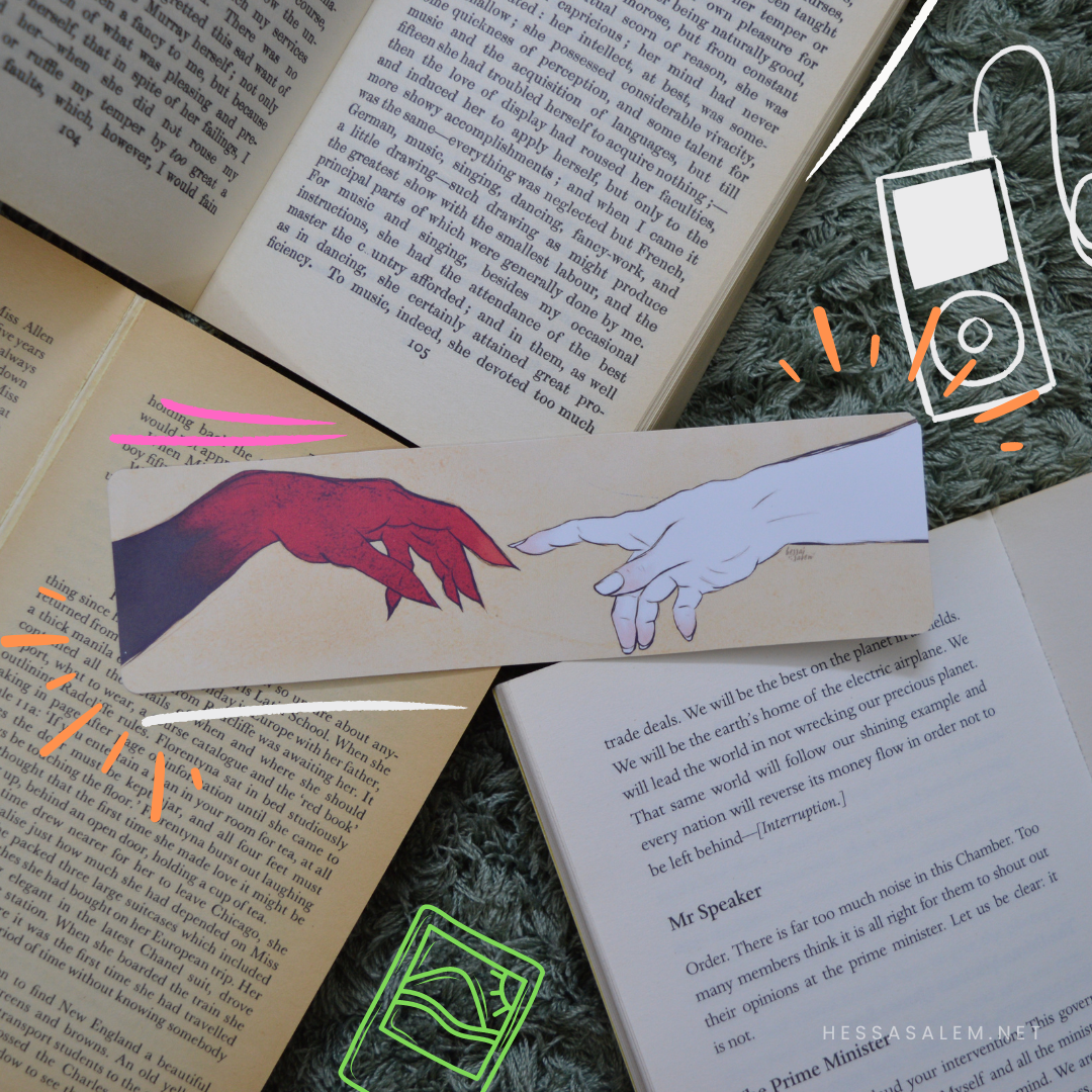 A bookmark with an inspired artwork of 'The Creation of Adam' from the famous Fresco painting by Michelangelo, 2023.