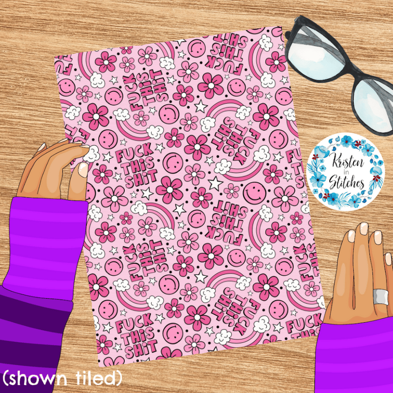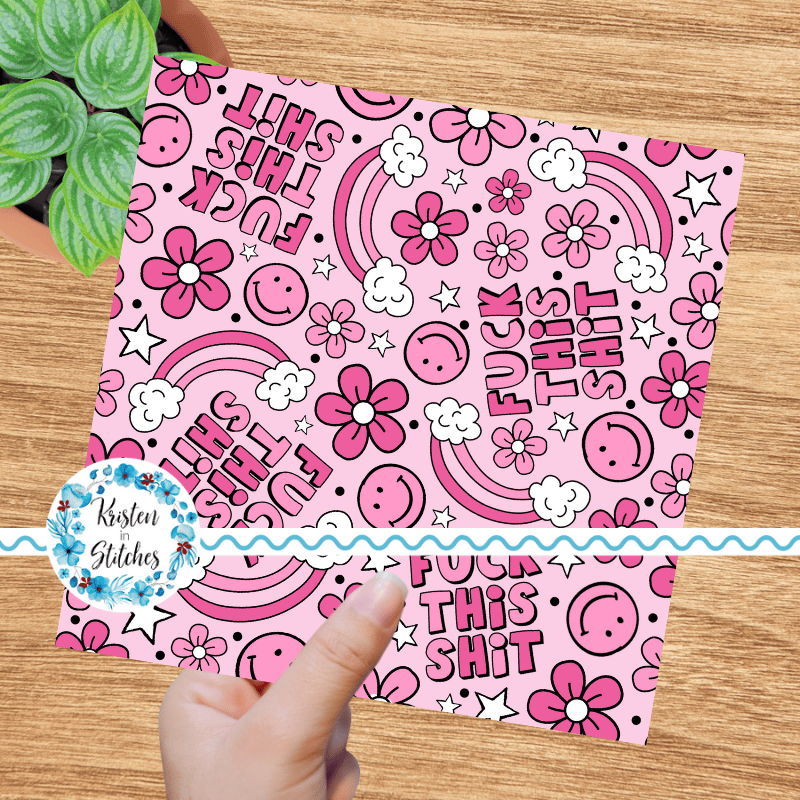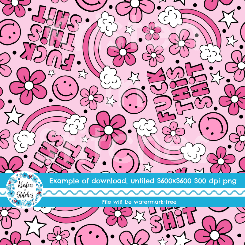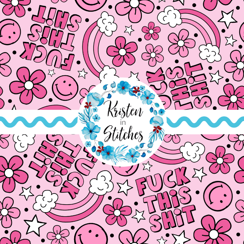 Fuck This Shit with happy smiley faces, rainbows, daisy flowers and stars in shades of pink.