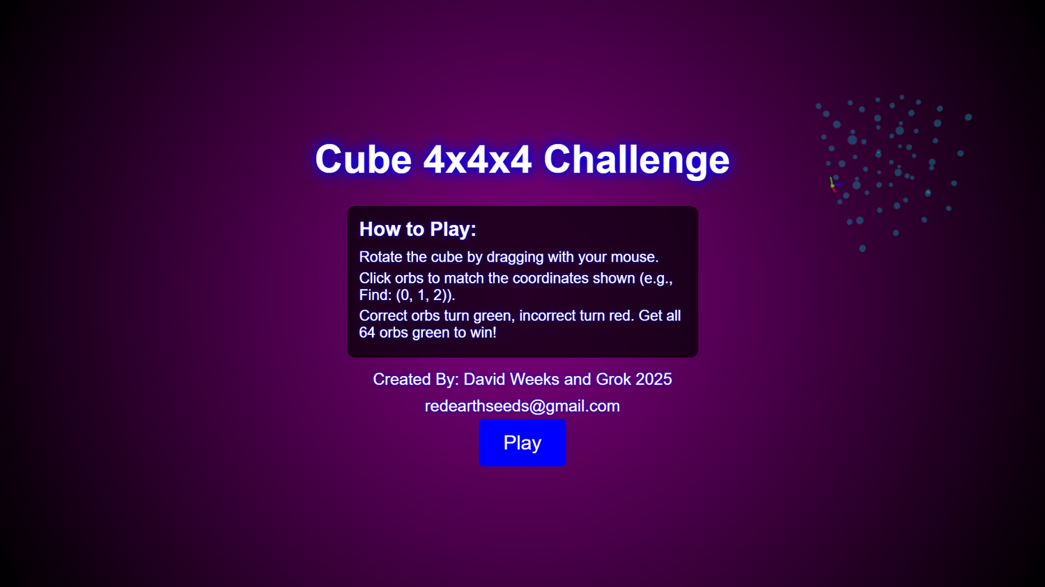 Hello World! : ) I've created a New Kind of Arcade Game No One Has Ever Seen Before!!! And it's AWESOME! Cube 4x4x4 is Level 2 Of 3 to teach you how to learn a 3 dimensional matrix by 3 coordinate node! Each Question appearing top center is a coordinate you must think and find to complete the Cube in 64 questions. Wrong Attempts turn red temporarily and get reshuffled until game is complete. Correct picks turn green and stay green until completed. Very Cool Game. Trains Spatial Reason. There isn't another game like this because I saw it in a dream and used AI to help create what I saw in my dream. The Game is Fun and Addictive. That is why there are to more levels after this. Once you can do 3x3x3, you can also do 4x4x4, and eventually the Challenge, a 5x5x5 with 125 questions. If you like my game, let me know directly by emailing me at redearthseeds@gmail.com Thank you to everyone who supports my programming.