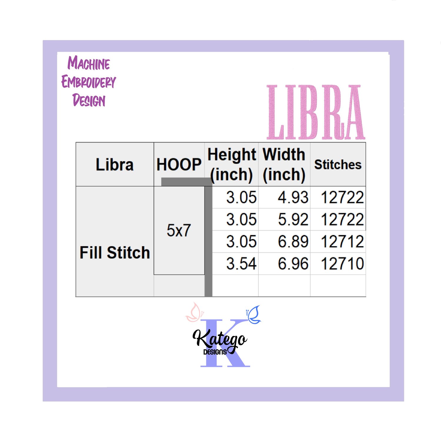 - Libra Fill Stitch: 4x4 and 5x7 Hoop.