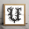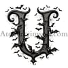 The letter U coloring book halloween occupying 90% of a 1024x1024 image. Use an Old English font style with clear outlines resembling a coloring book page. The character is composed of intricate bat silhouettes, creating a spooky Halloween atmosphere. Use only pure black (#000000) for the character and outlines, and white for the background.2D, black and white style resembling a high-quality adult coloring book page.