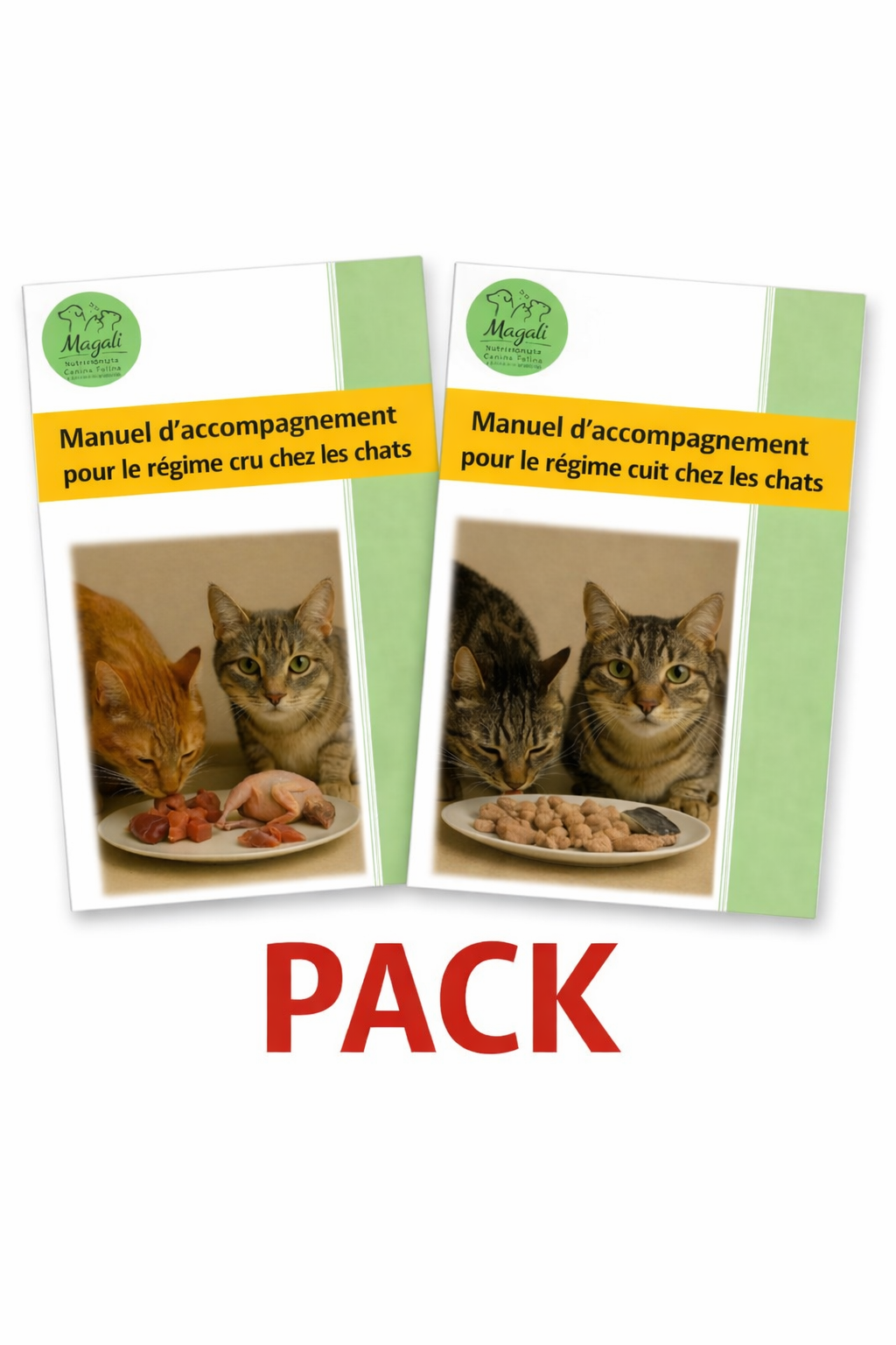 Ce pack réunit deux manuels d’accompagnement complets destinés aux familles qui souhaitent nourrir leur chat avec une alimentation naturelle, soit cuite, soit crue.