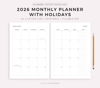 This is a printable 2026 monthly planner with holidays — just download, print, and start using it right away.