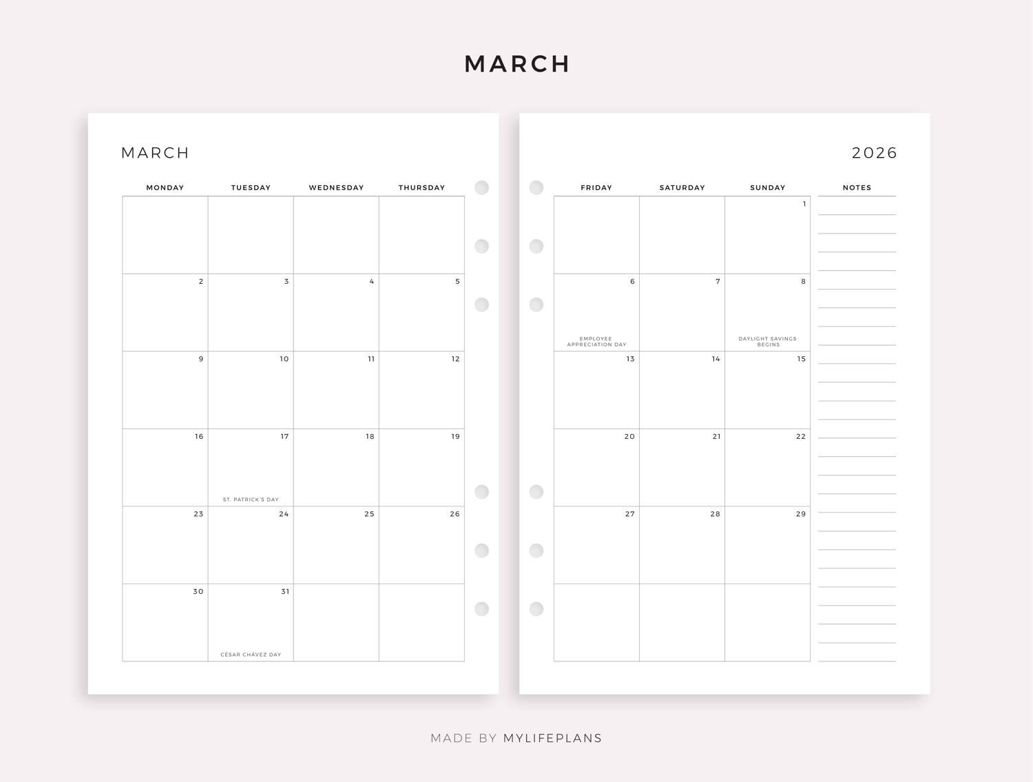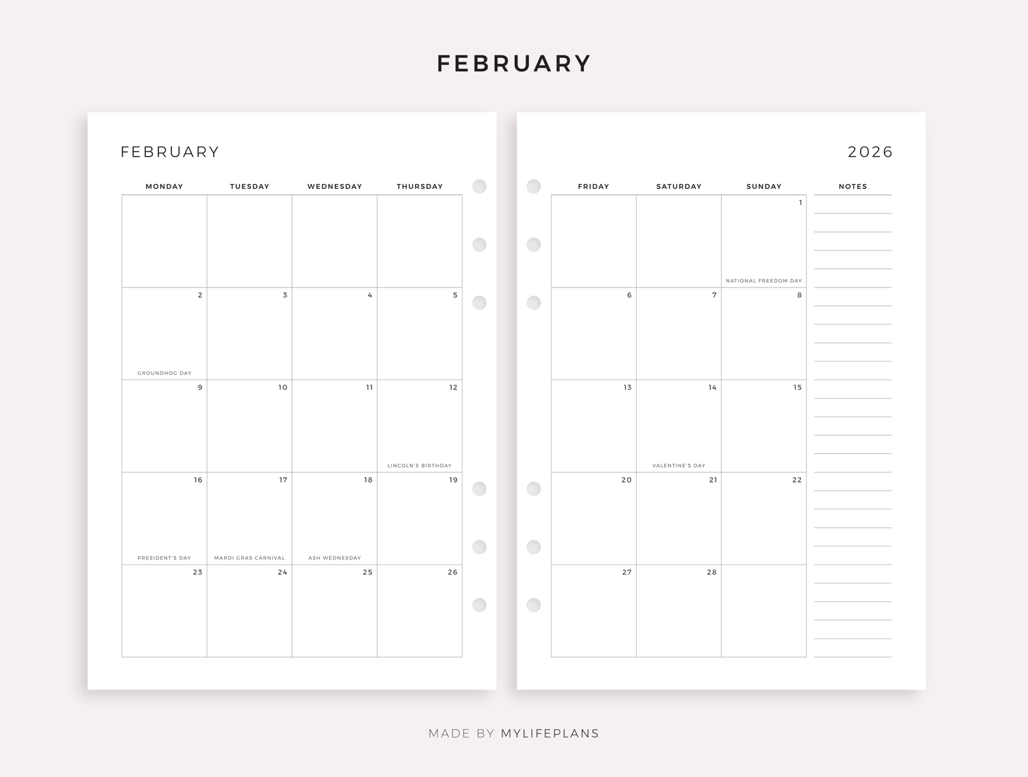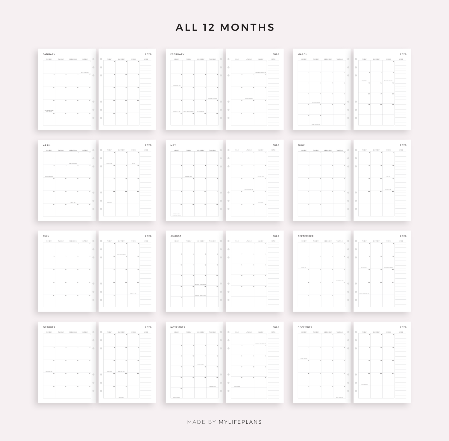2026 Monthly Planner with Holidays, Dated Month on 2 Pages, Monthly Organizer, A4/Letter Size