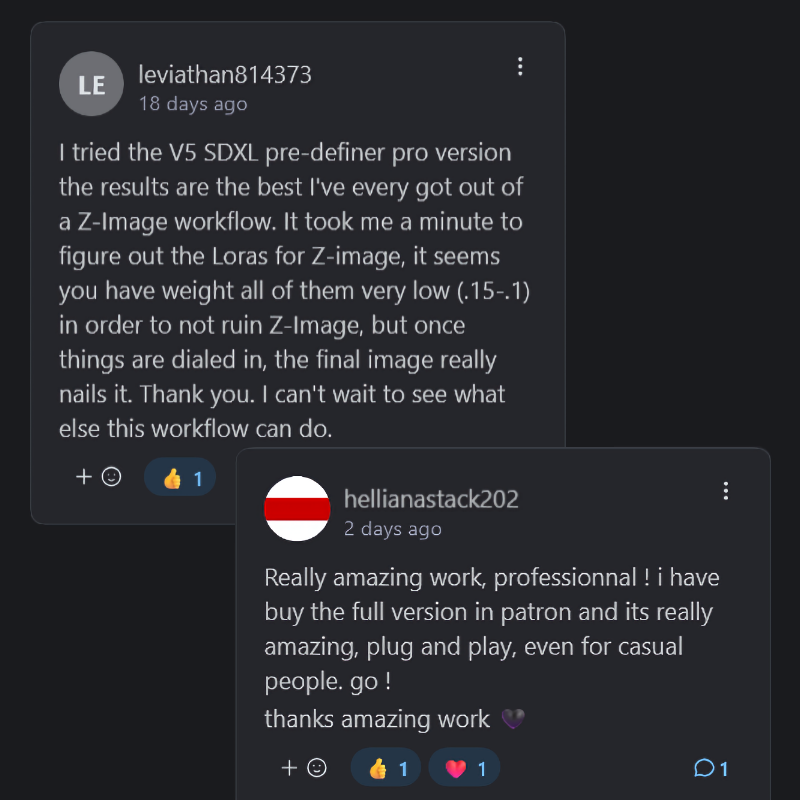 Two different workflow versions, detailed manual "The ZIT BIBLE", free bugfix updates & future discounts included!