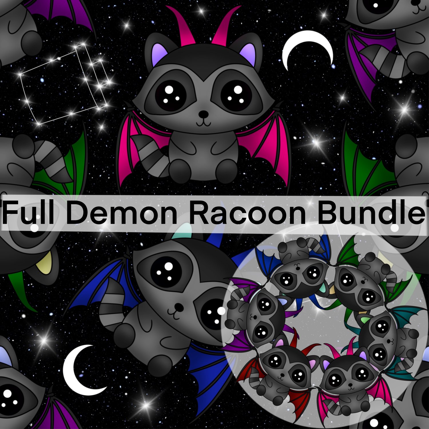 This bundle includes all demon raccoon files in the drop in all colorways with all backgrounds and all PNGs.