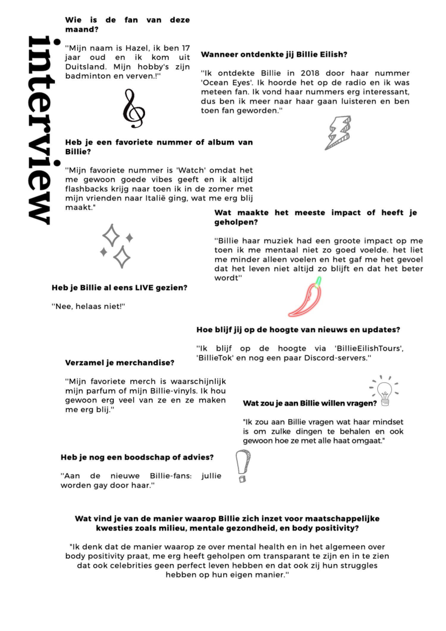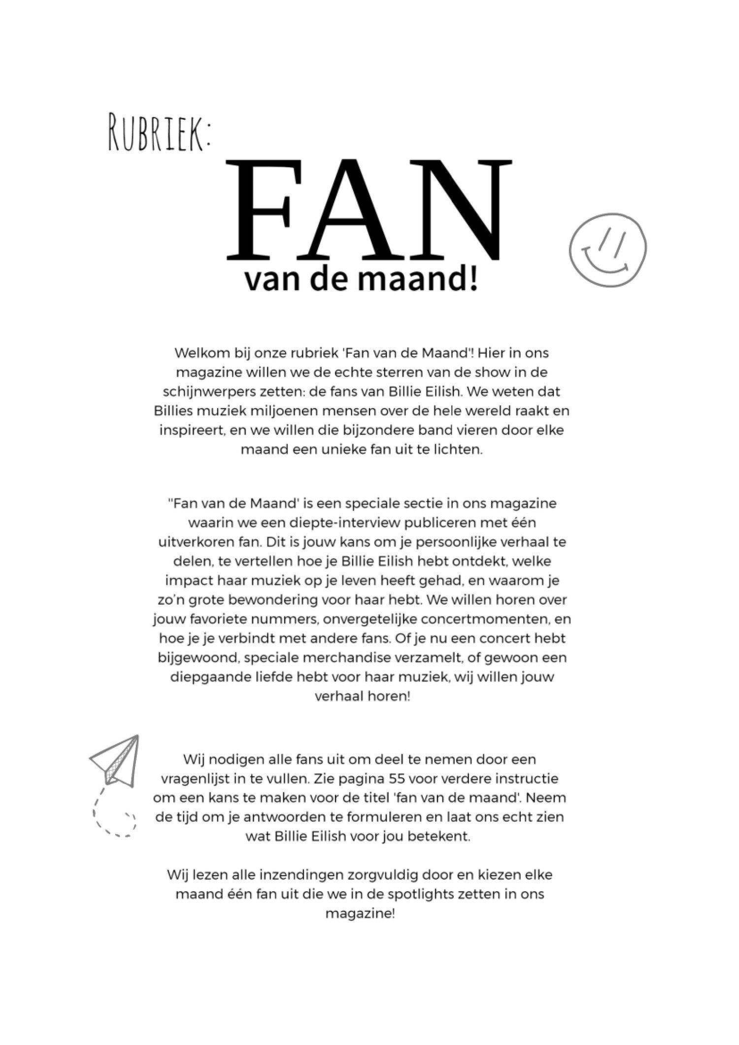In deze editie duiken we dieper in het leven van Billie Eilish en haar zorgen om het klimaat. Ook gaan we in gesprek met 4 Billie fans. 2 vertellen ons over hun eerdere ervaring van een concert en de andere 2 vertellen over hoe ze verwachten dat hun eerste ervaring zal zijn. Ook kun je deze editie weer lekker aan de slag in de keuken! Lana del Rey gaat in gesprek met Billie over haar nieuwe album, dat recentelijk is uitgekomen, en over de dingen die erbij komen kijken als je opgroeit in zo'n situatie. Uiteraard in deze editie kun je weer je favoriete posters bekijken, spelletjes spelen en nog veel meer!