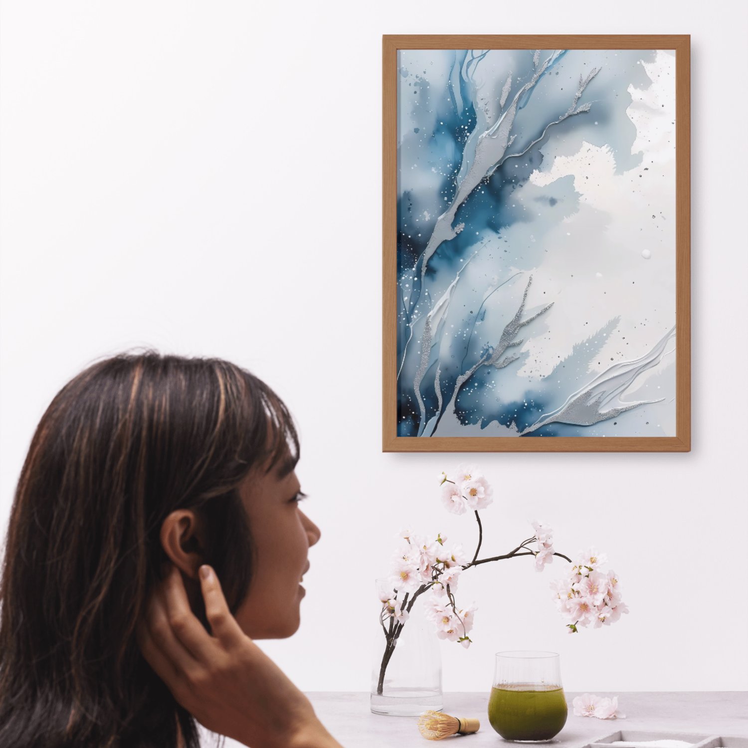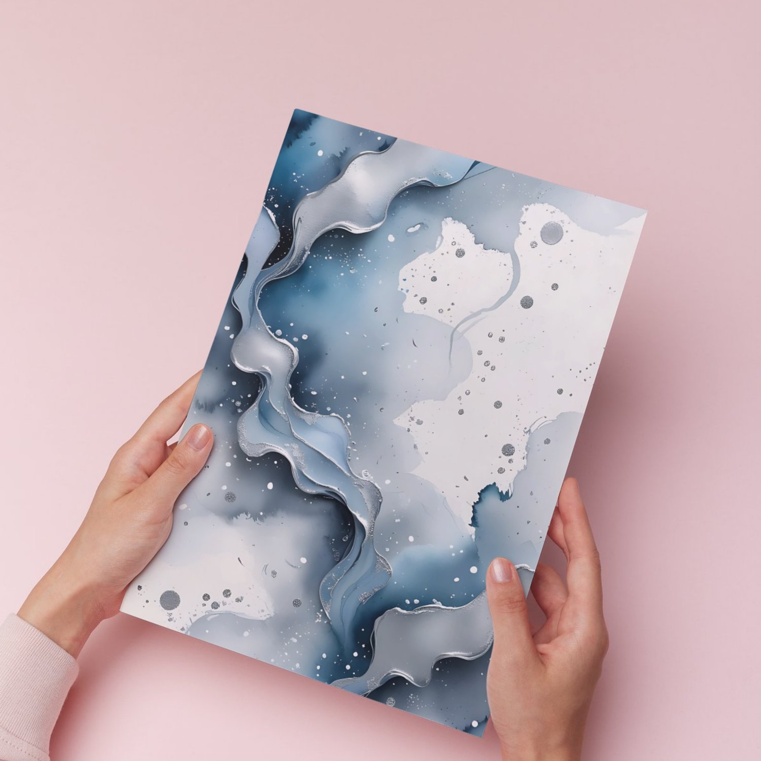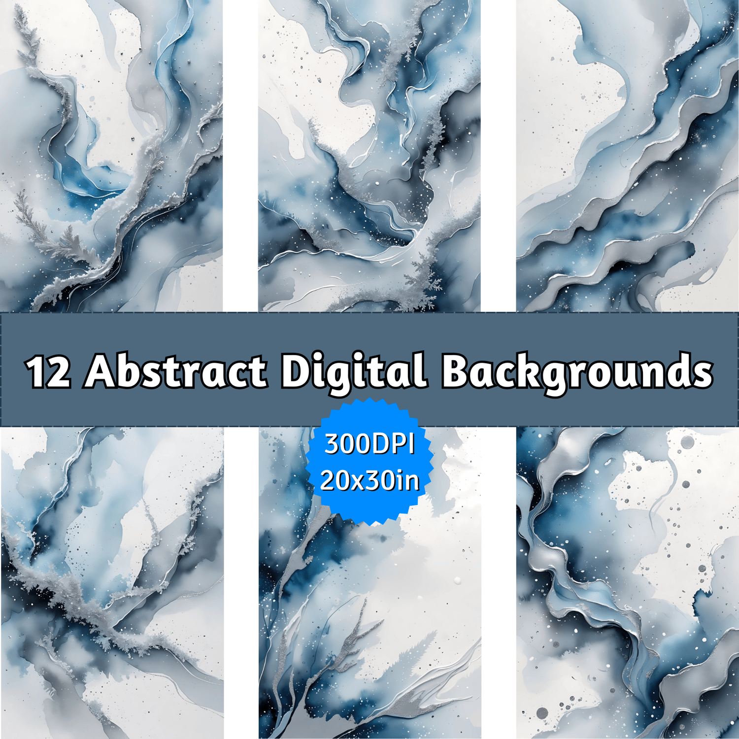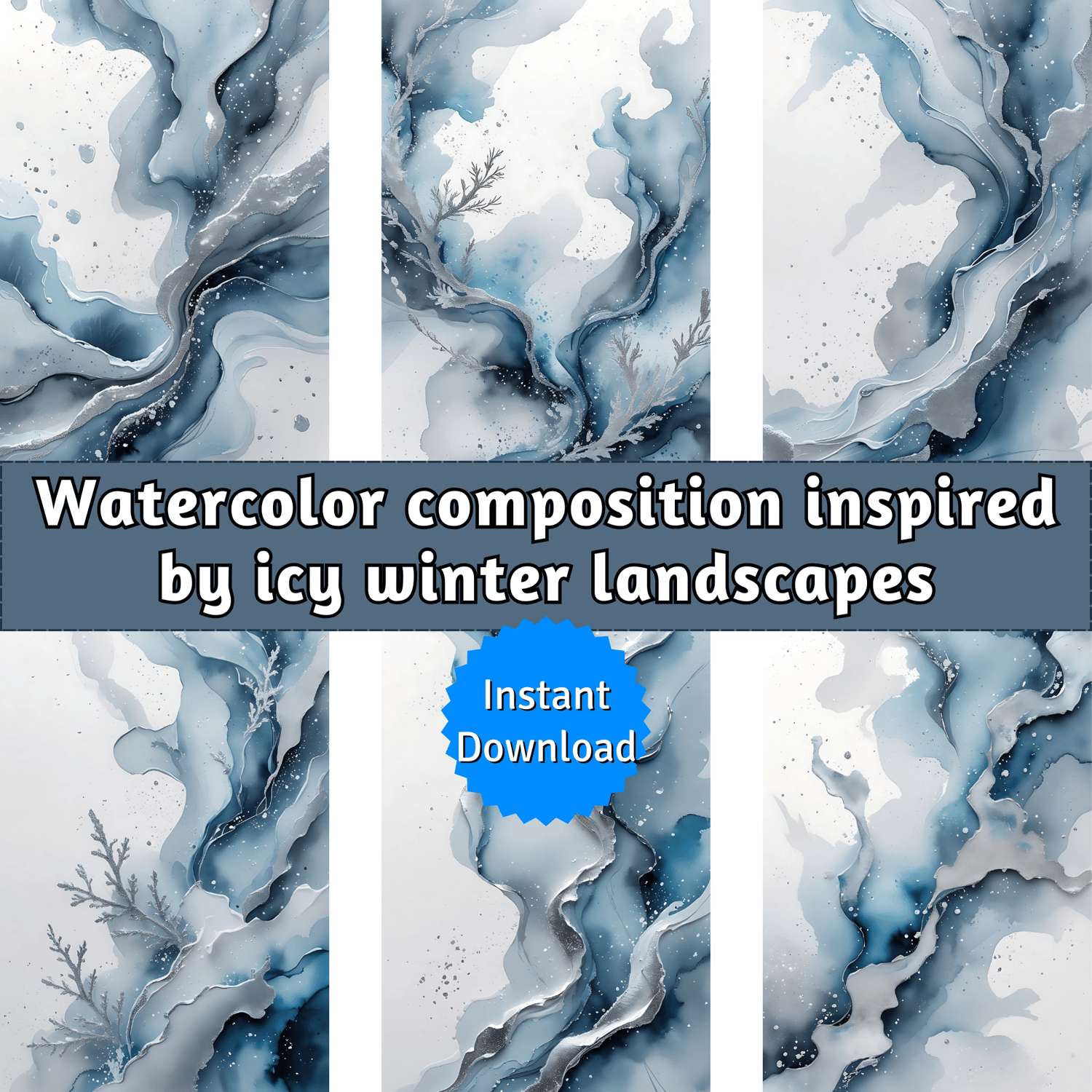 Capture the serene beauty of icy winter landscapes with this set of 12 elegant abstract watercolor backgrounds. Featuring a cool-toned palette of soft frosty blue, misty gray, and shimmering silver, these designs evoke a crisp, wintery feel. Delicate frost-like textures and smooth watercolor gradients create a natural, fluid effect, while metallic silver accents add a touch of sophistication. The subtle speckled background mimics falling snow on crisp white watercolor paper, enhancing the seasonal aesthetic.