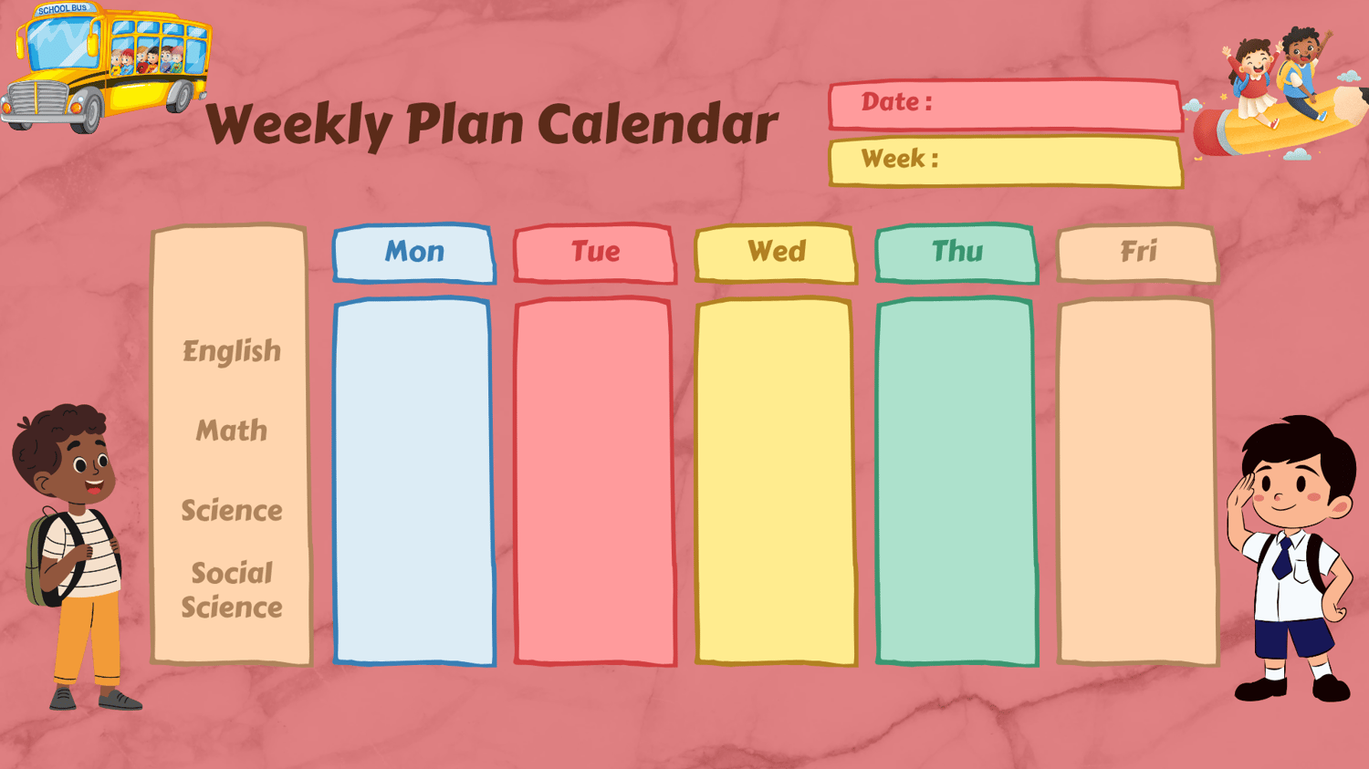 Kids Weekly calendar planner for classrooms or for home