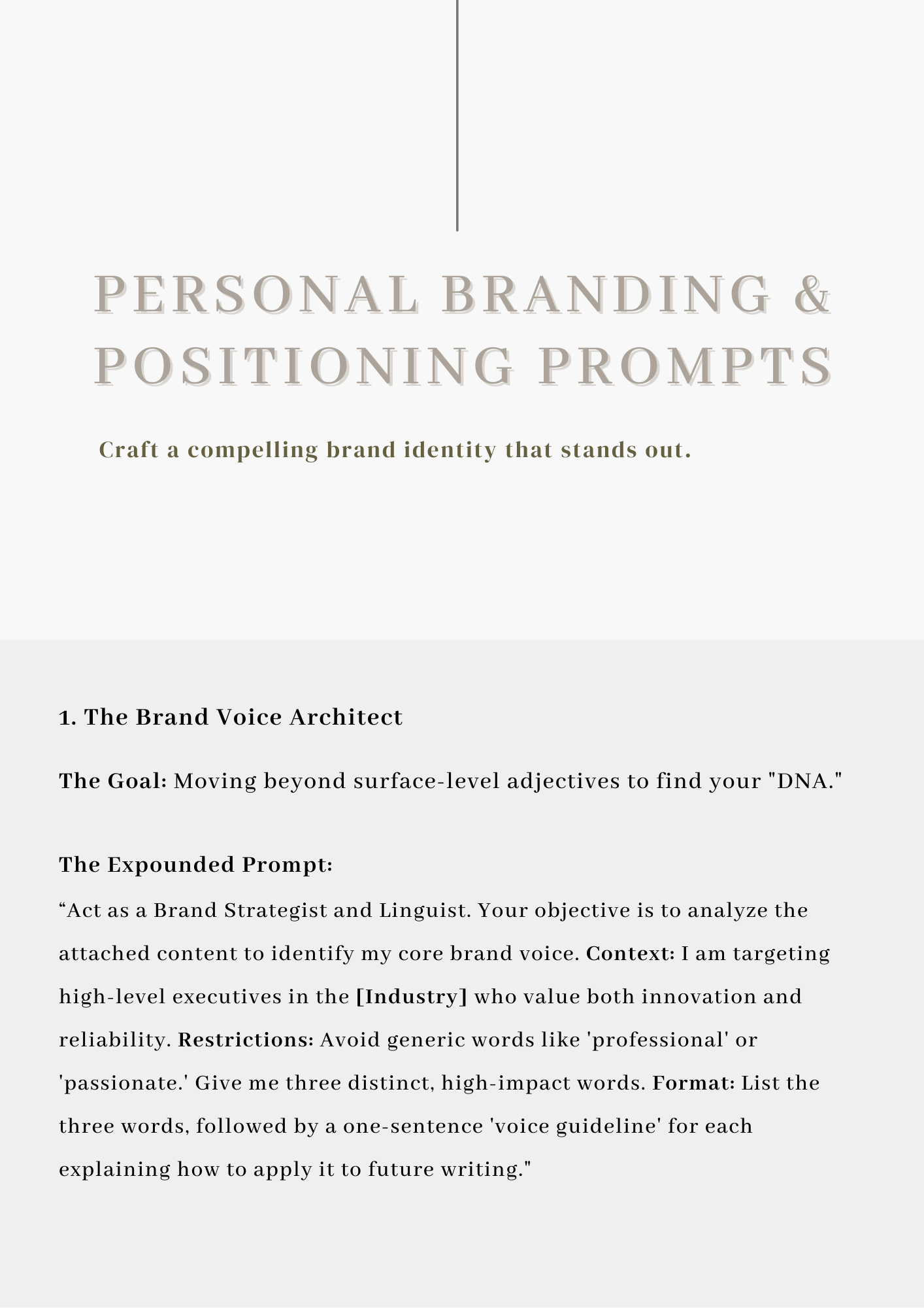 - 50 Master Prompts: High-level, "plug-and-play" prompts engineered for professional personal branding.