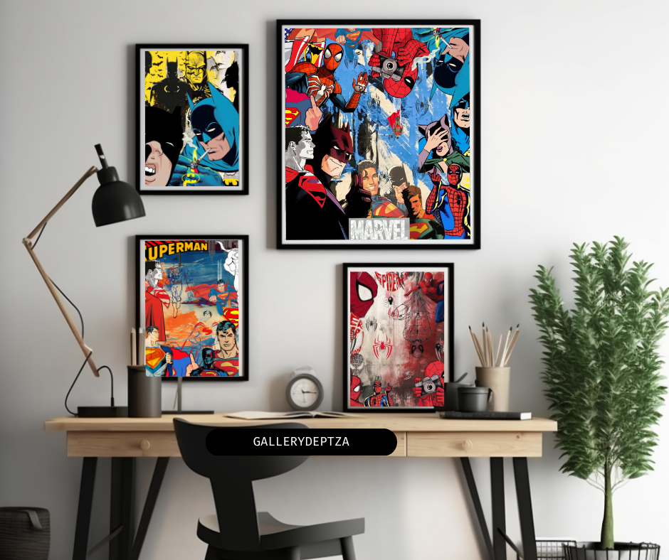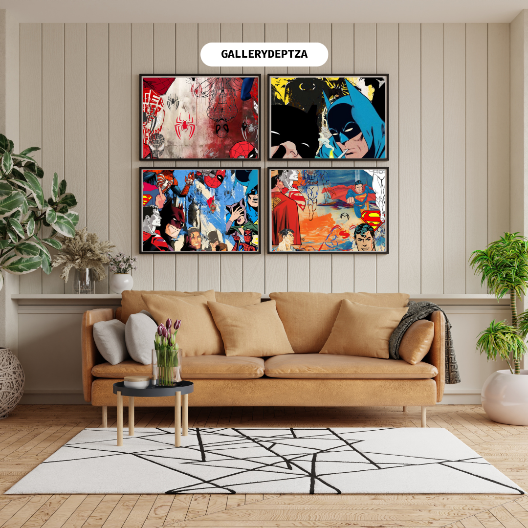 Bring the world’s most iconic heroes to life with this Superhero Animated Art 4-Pack — featuring Spiderman, Batman, Superman, and an exclusive Marvel x DC crossover poster uniting all three in one powerful scene.