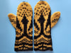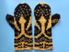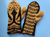 This is a pattern for double-knit oven mittens using a Japanese kanji character “火 (Fire)” as a motif. The character is a pictographic representation of a fire. I added other elements of fires around the character, such as sparks. The design on the cuff area is reminiscent of an item used by Japanese firefighters in the Edo period, called Matoi. Matoi was used to identify different groups of fierfighters, and each group had an intricate Matoi design to raise fighters’ morale.