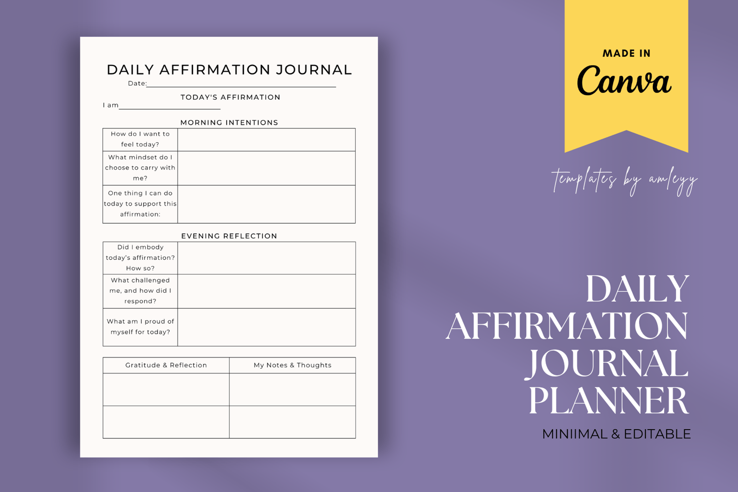Daily Affirmation Journal Planner Template – Editable Canva Printable | Mindfulness & Self-Care Journal