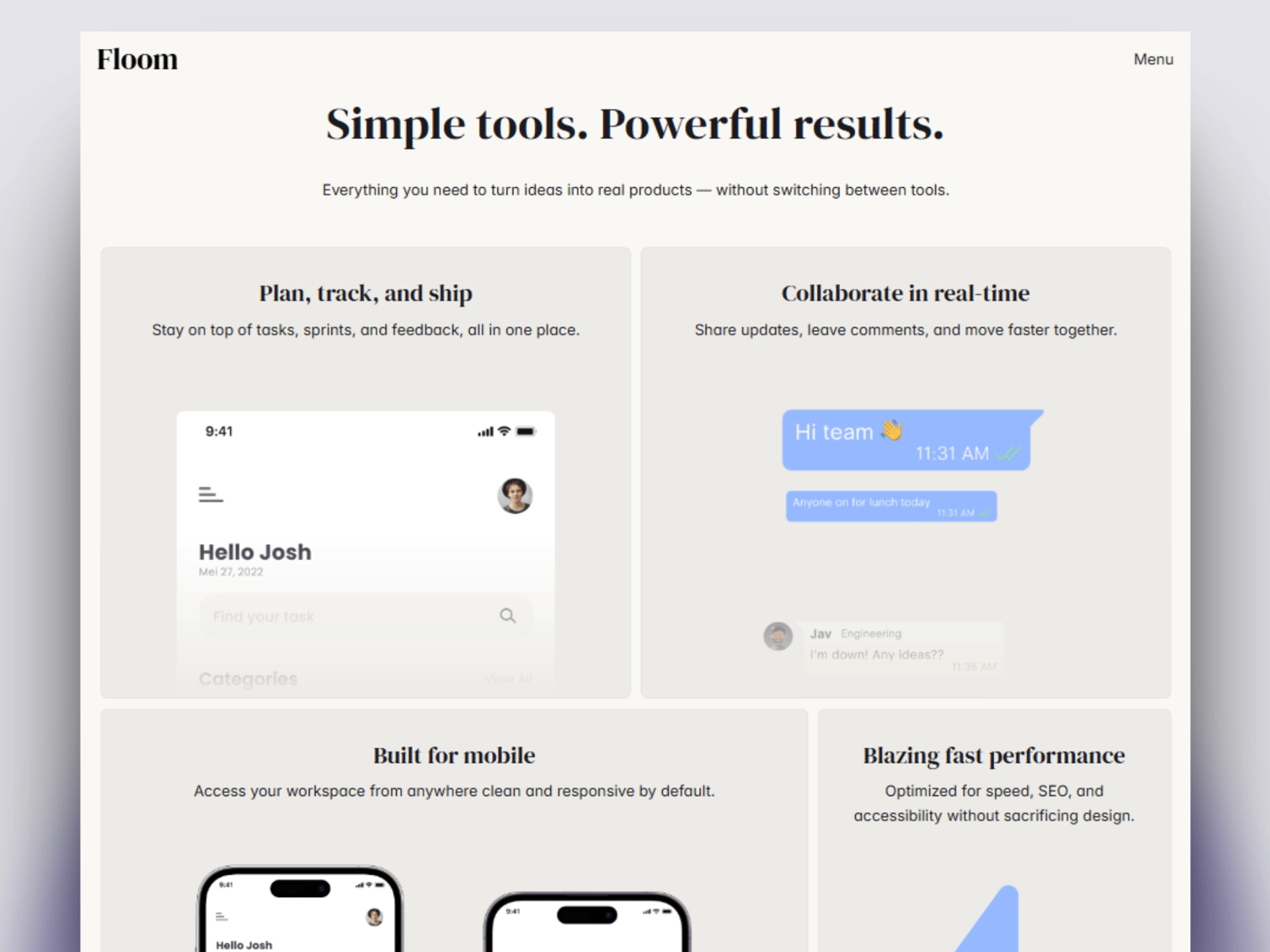 Ideal for early-stage startups, product makers, and creative entrepreneurs, Floom helps you tell your story clearly, convert visitors with confidence, and go live without the usual friction.