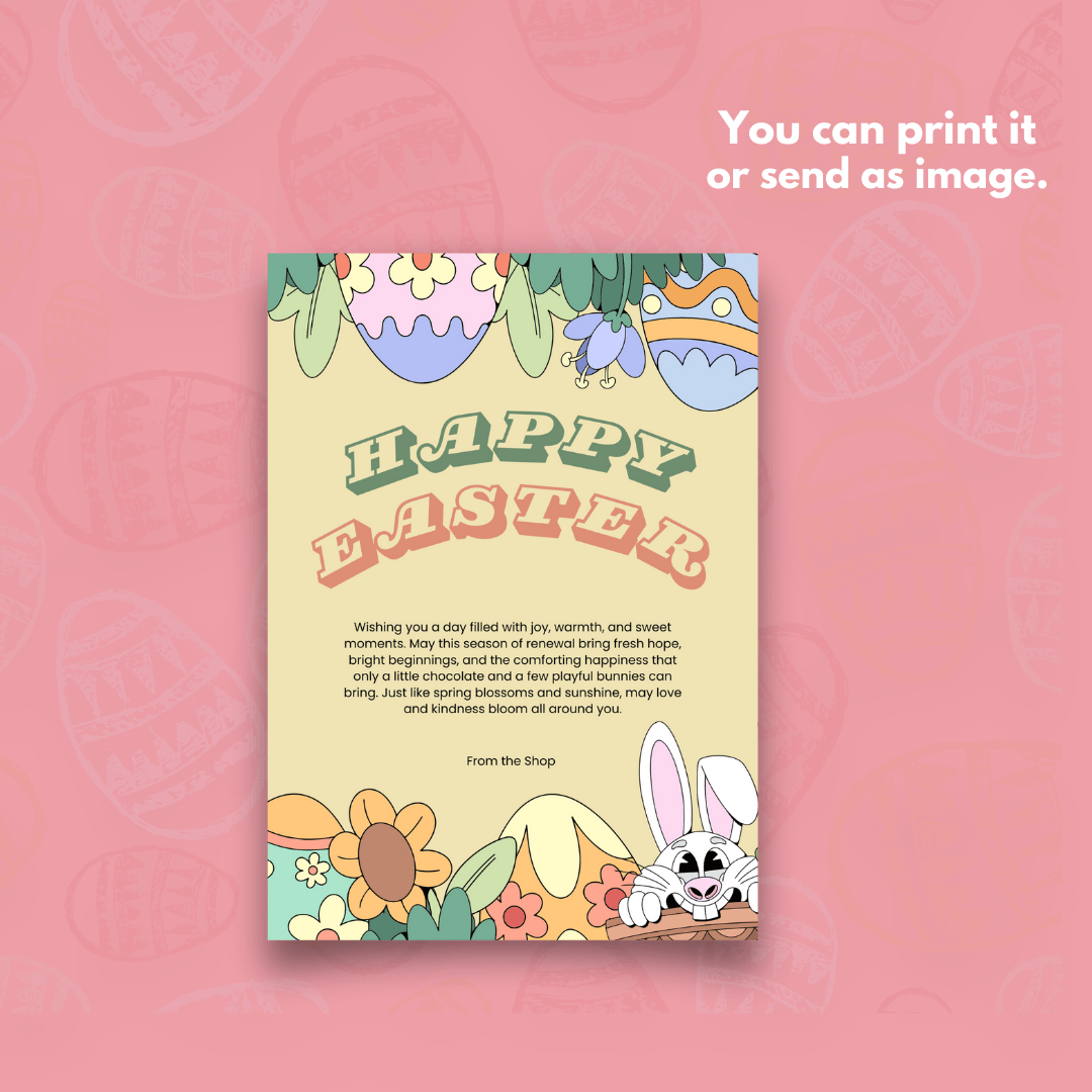 This simple watercolor-style design features a cheerful chocolate bunny, colorful spring elements, and a festive “Happy Easter” message. Perfect to express the spirit of rebirth, love, and connection with family and friends during April celebrations.