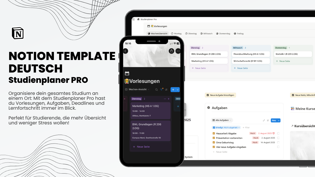 Jetzt Zeit sparen, Stress reduzieren und das Studium im Griff haben – mit dem Notion Template Deutsch: Studienplaner PRO.