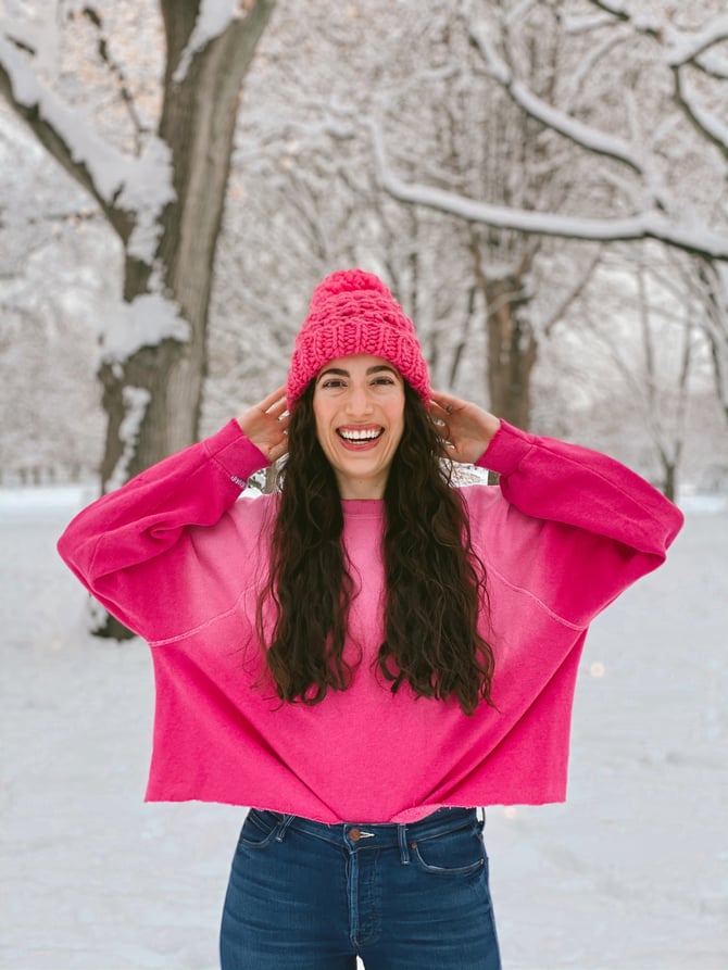 SAMPLES SHOWN Worn sample is knit in we are knitters the wool in color Bubblegum Flat lay samples are knit in Wool and the Gang Crazy Sexy Wool in color Brown Sugar & Ivory White