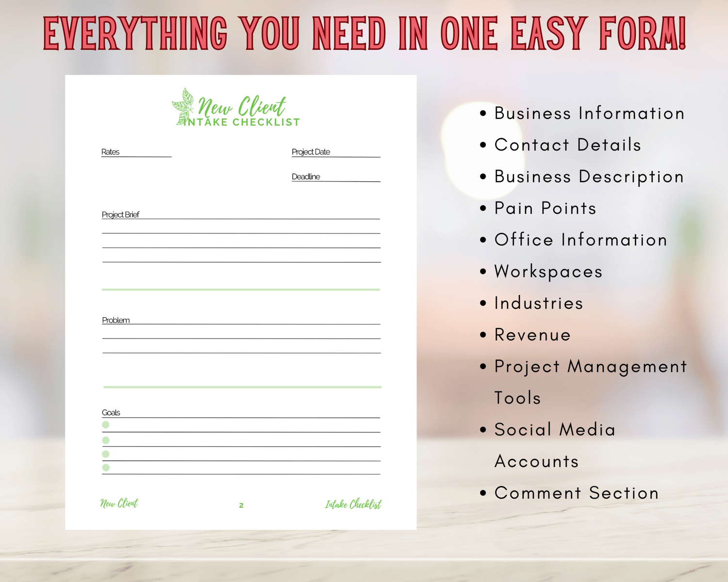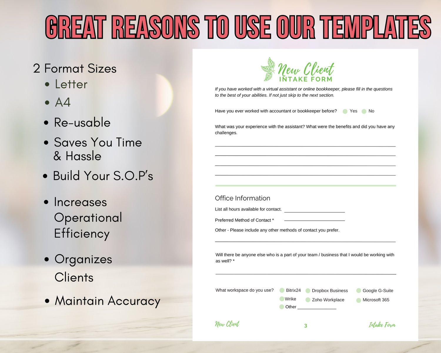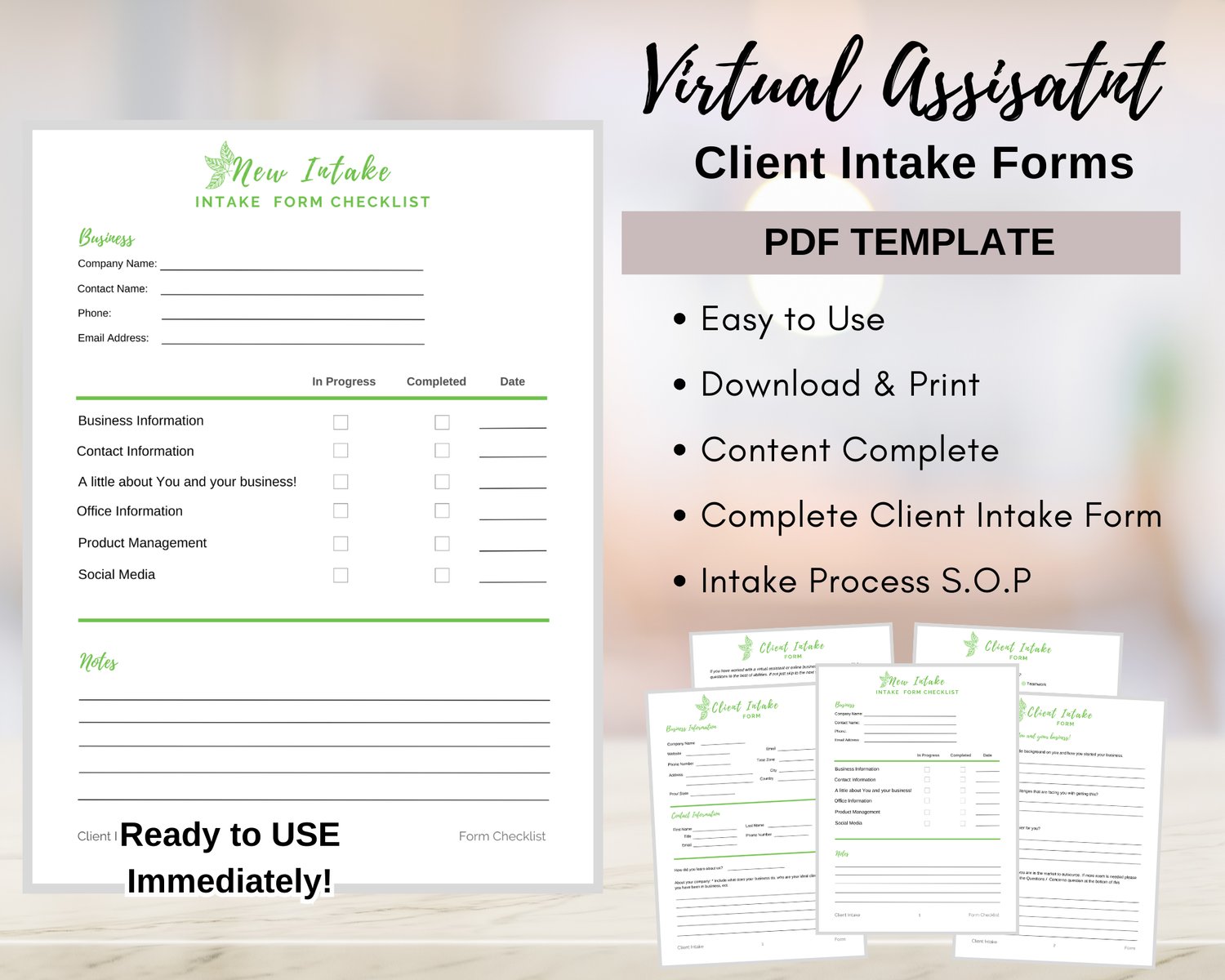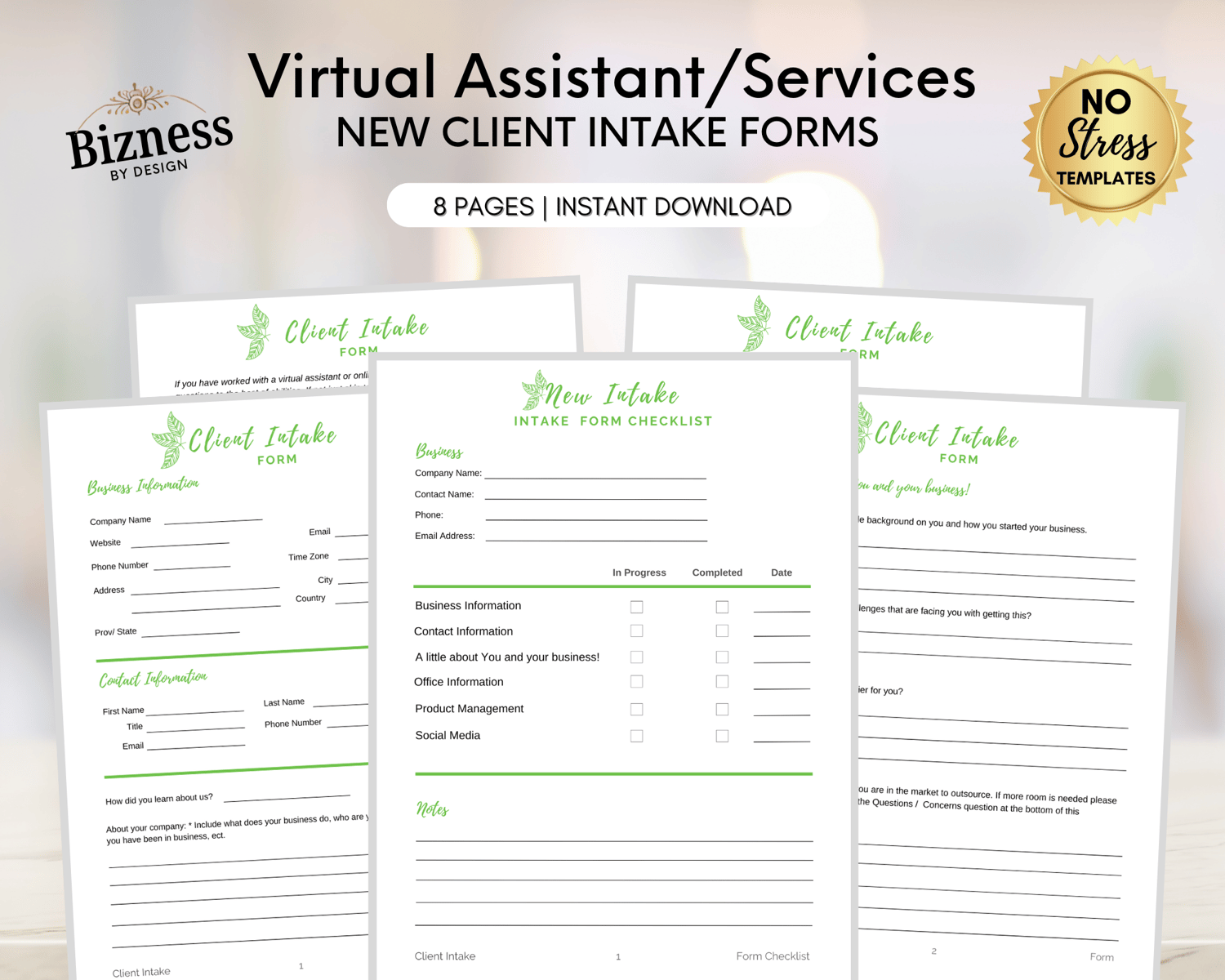 Virtual Assistant/Services New Client Intake Forms PDF Template {New Leaf Theme}