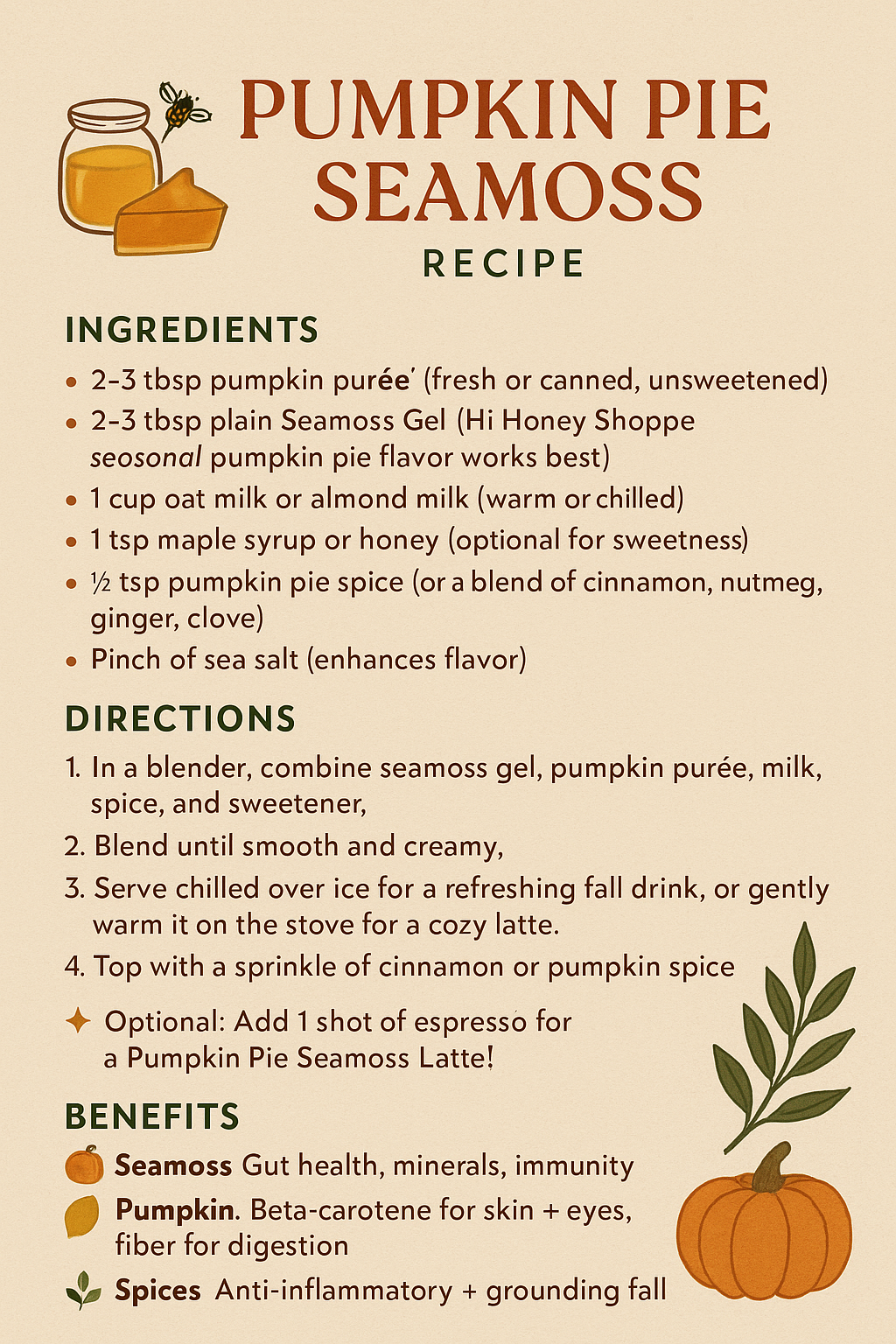 Bring the cozy vibes of fall into your wellness rituals with this Pumpkin Pie Seamoss Recipe Card.