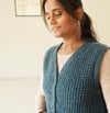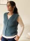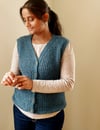 This vest is worked flat from the top-down. The construction begins at the back, shaping shoulders and then the armhole. Then stitches are picked up and knit at the sides for the front left and right shoulders which are worked separately and then joined to form the front. The front is worked flat and the neckline and armhole are shaped simultaneously.