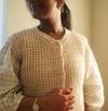 The front and back are joined at the underarm. The rest of the body is continued to be worked flat, in one piece. The bottom hem is finished with folded-hem bind-off. Finally, stitches are picked up and knit to create a double-knit edge for the armholes and button band.