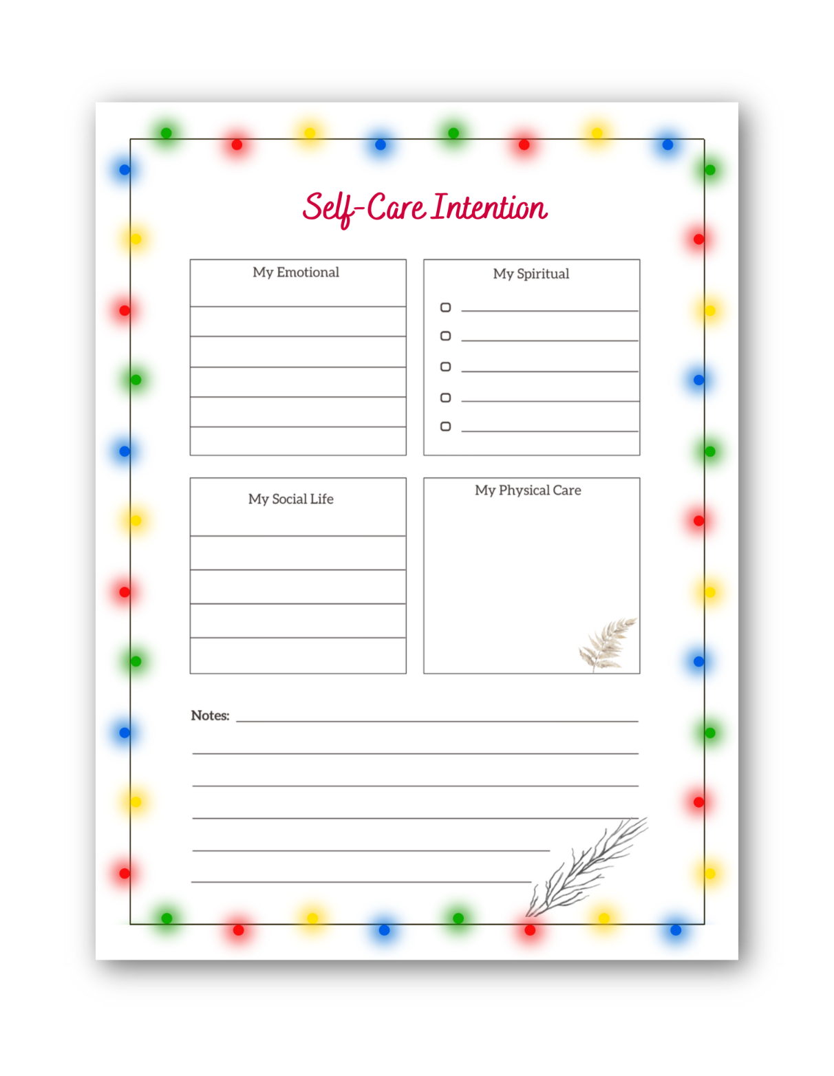 Self-Care Intent Worksheet for emotional, spiritual, social life and physical self-care