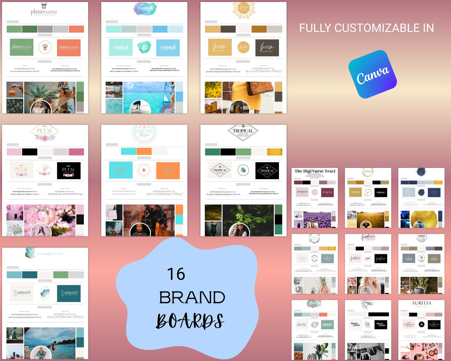 - 16 fully editable Canva branding templates