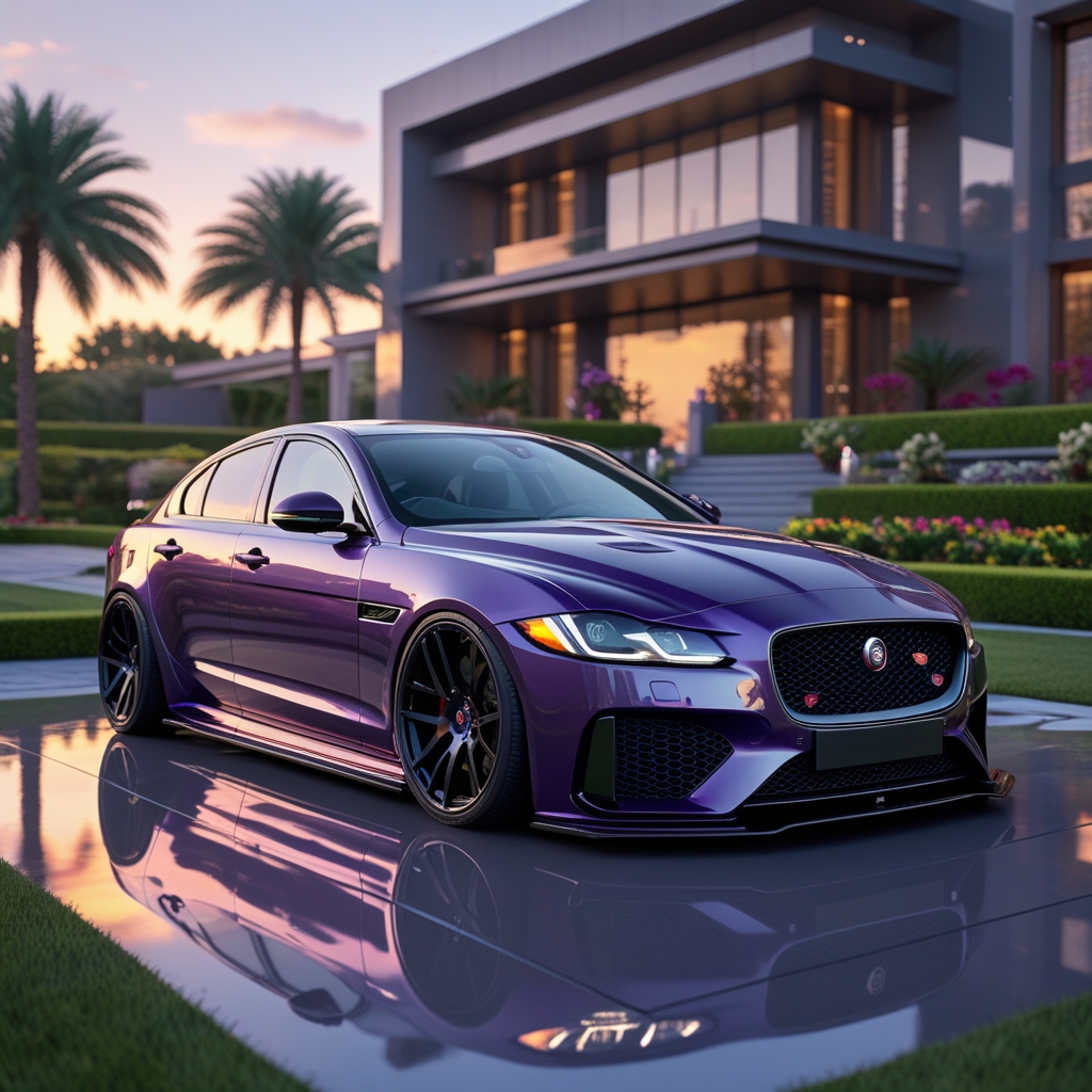 A luxurious Jaguar GT Viola Hong Kong with a two-layer dark purple metallic paint, fully customized with a Brambus-style body kit, featuring matte black mags wheels. The car is parked in the driveway of a modern luxury mansion with sleek architecture, large glass windows, and elegant façades. Surrounding the mansion is a beautifully landscaped garden with trimmed hedges, colorful flowers, palm trees, and ambient lighting that reflects softly on the car’s glossy surface. The scene is during golden hour, with warm sunlight highlighting the metallic paint and casting gentle shadows across the driveway. Ultra-realistic, cinematic perspective, high-detail reflections, and photorealistic textures on both the car and environment."
