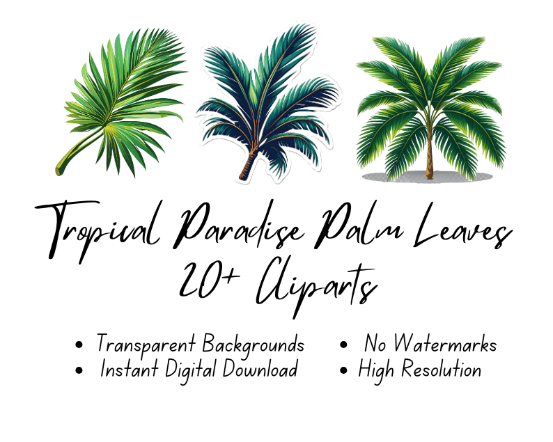 Escape to a tropical paradise with this vibrant collection of 20+ Tropical Palm Leaves Cliparts! Perfect for adding a fresh, exotic touch to your digital designs, invitations, scrapbooking, or printable art projects. Each high-resolution clipart is crafted with intricate detail and rich colors, capturing the lush beauty of tropical foliage.