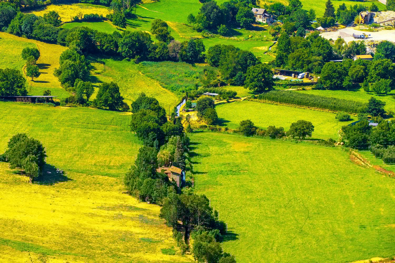 Rural landscape with cultivated land separated by rows of trees. The colors have been strengthened a little to bring more life to the photograph. Have you seen the calves relaxing surrounded by nature?