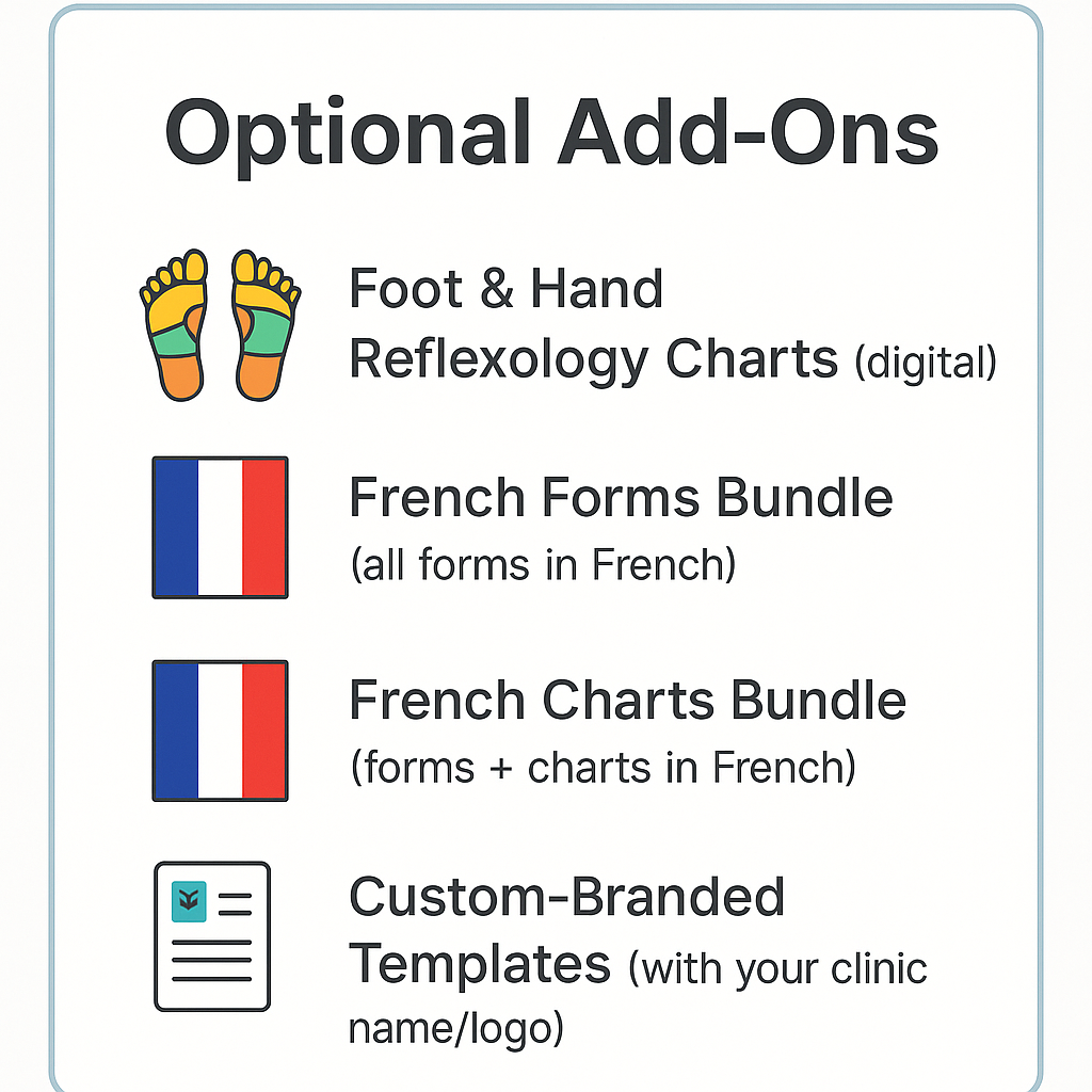 This bundle is perfect for reflexologists who want maximum flexibility in managing client records, delivering bilingual care, and referencing charts during sessions. It’s the complete professional setup for clinics serving diverse clients.