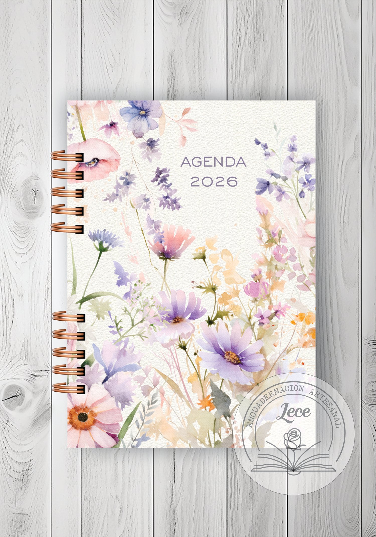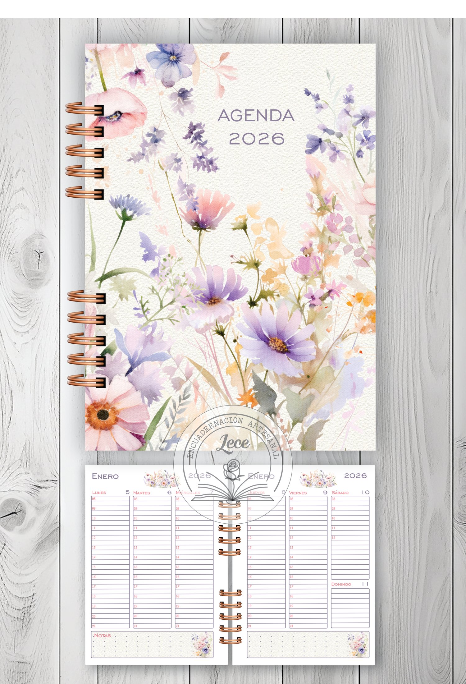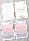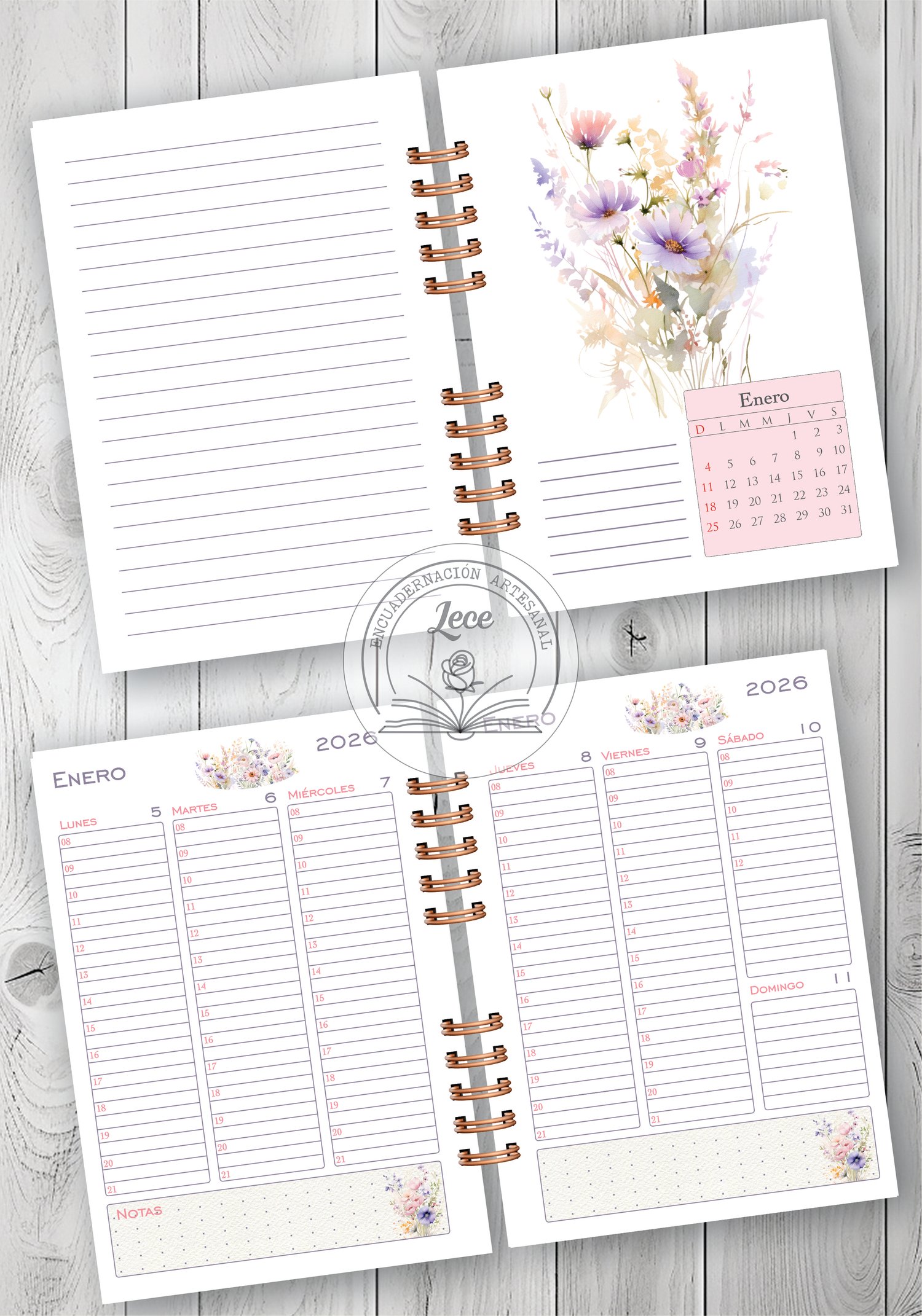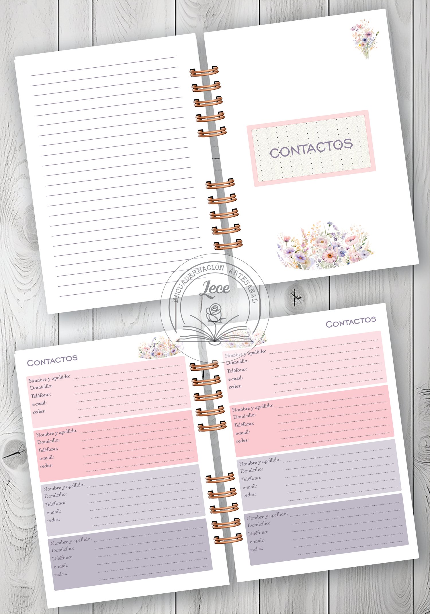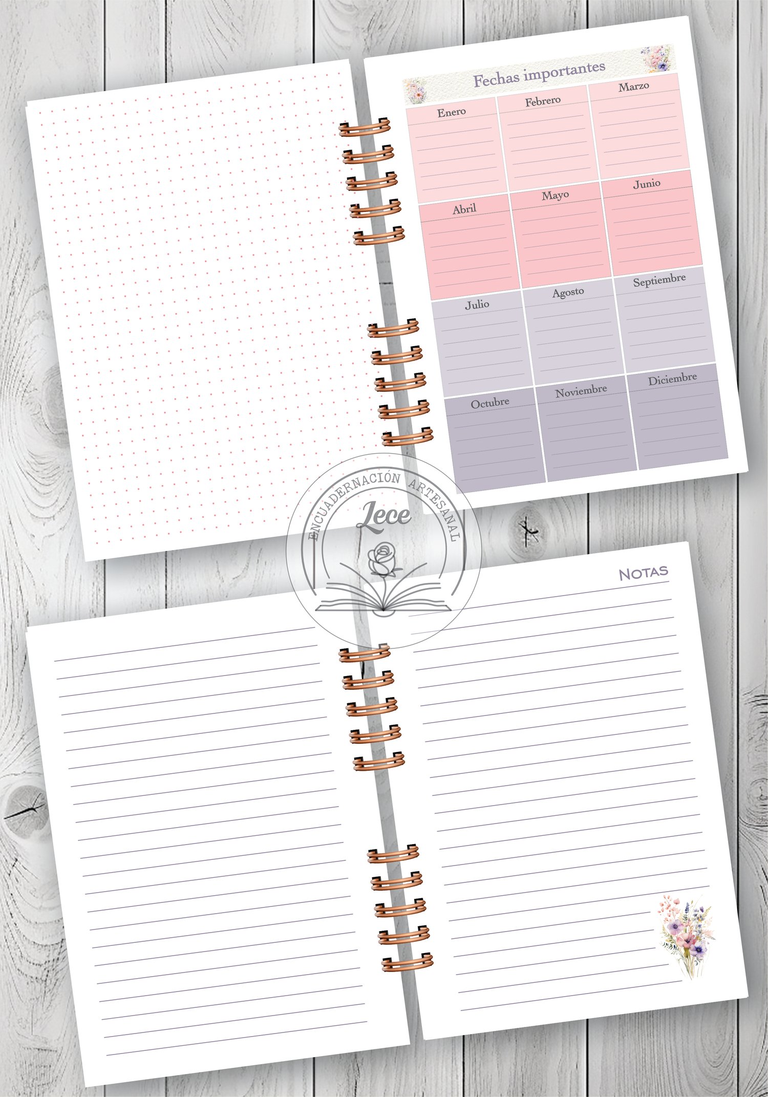 - 1 modelo de interior de agenda y sus variantes para imprimir en tamaño A5 para anillado y costura