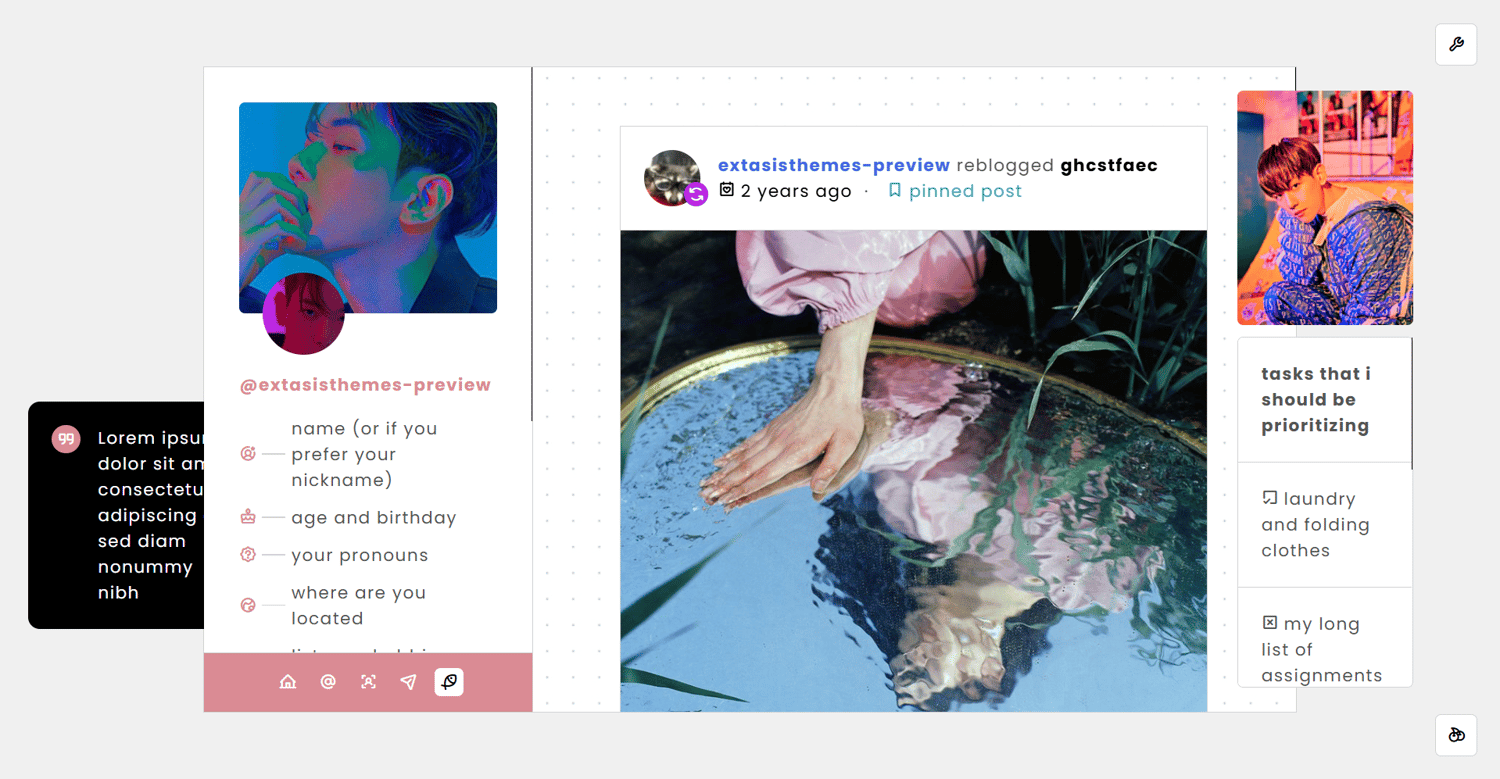 features: 150x200px sidebar image, 100x100px icon image, 220x180px about image, 70x70px about icon image, blog title, blog subtitle, five custom links, search bar, quote section, short updates section, about information section, tasks section, 450px to 540px text posts