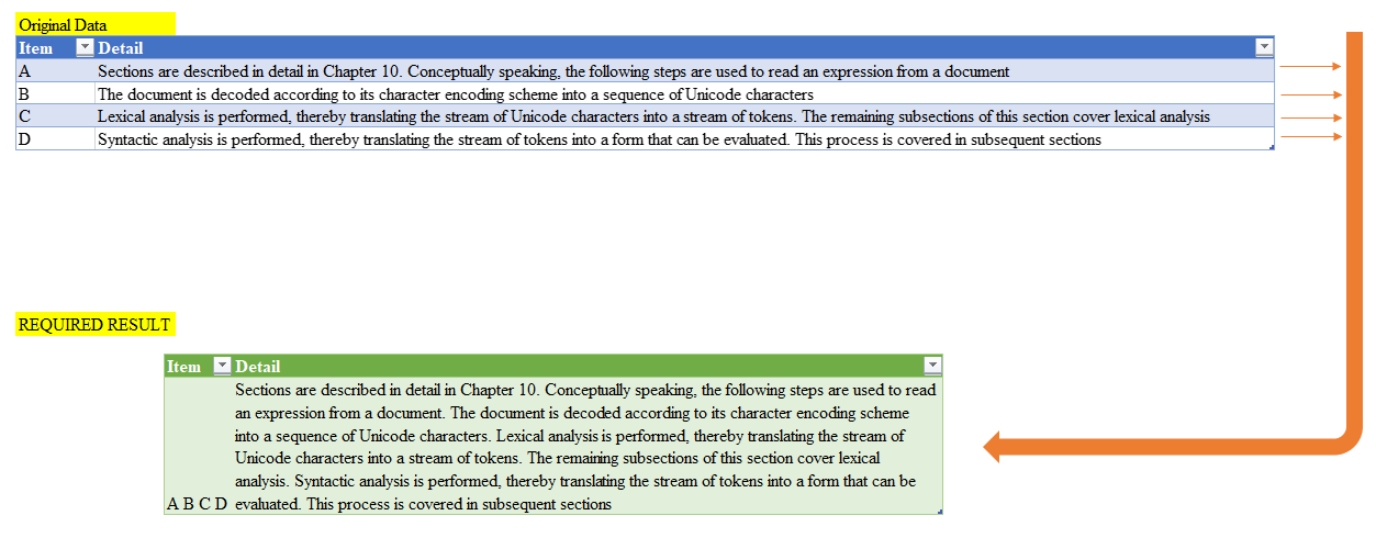 Sometimes, you need to combine multiple rows into one cell. To do this in excel we can use the CONCATENATE function. With simple data we can do it easily.
