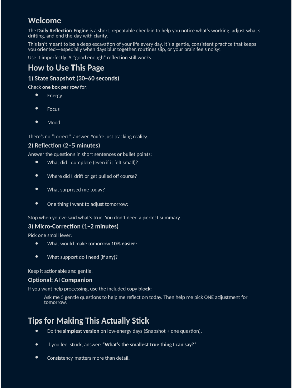 The Daily Reflection Engine is designed to be used consistently, not perfectly. It’s not about deep journaling or overthinking — it’s about staying oriented when days blur together, routines slip, or your brain feels noisy.
