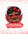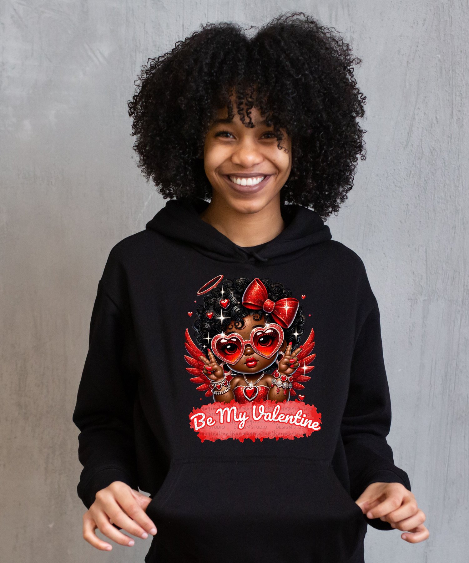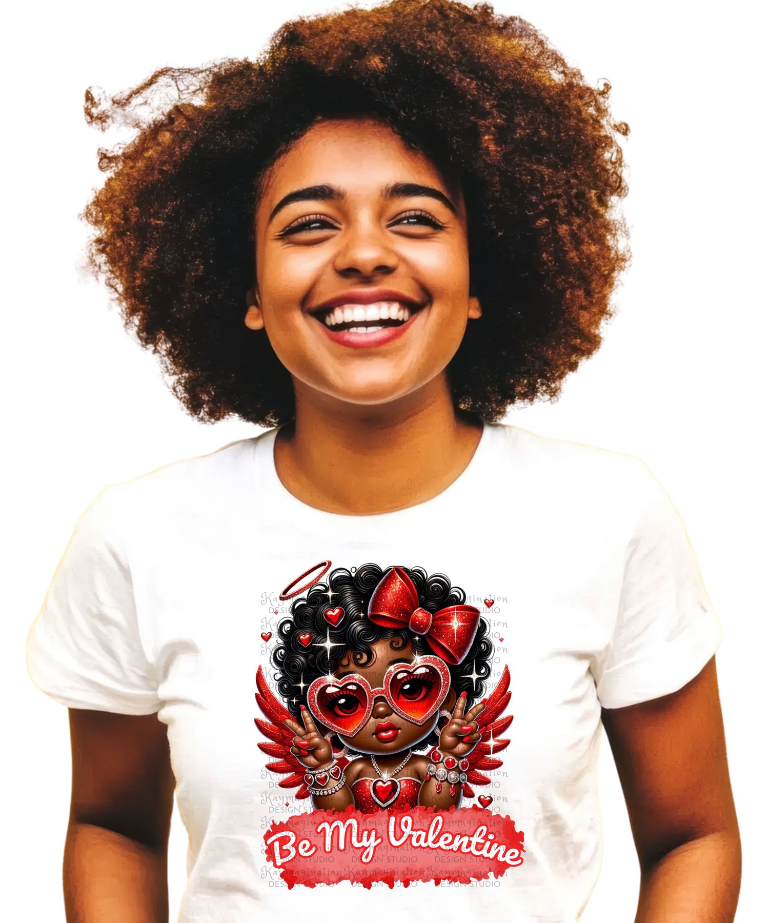 Celebrate love in the cutest way with this adorable, heart-filled graphic! Featuring a sweet cartoon character with curly hair, heart-shaped sunglasses, and sparkling red wings, this design is all about spreading those Valentine’s vibes. With a bold "Be My Valentine" message, framed by playful hearts, this design is perfect for Valentine’s Day apparel, accessories, and more.