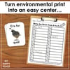This Write the Room center encourages students to observe and record print in their environment. Students use a clipboard and pencil to search for words in the classroom—whether from anchor charts, posters, name tags, or the included themed word cards—and record them on a category-specific worksheet.